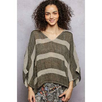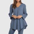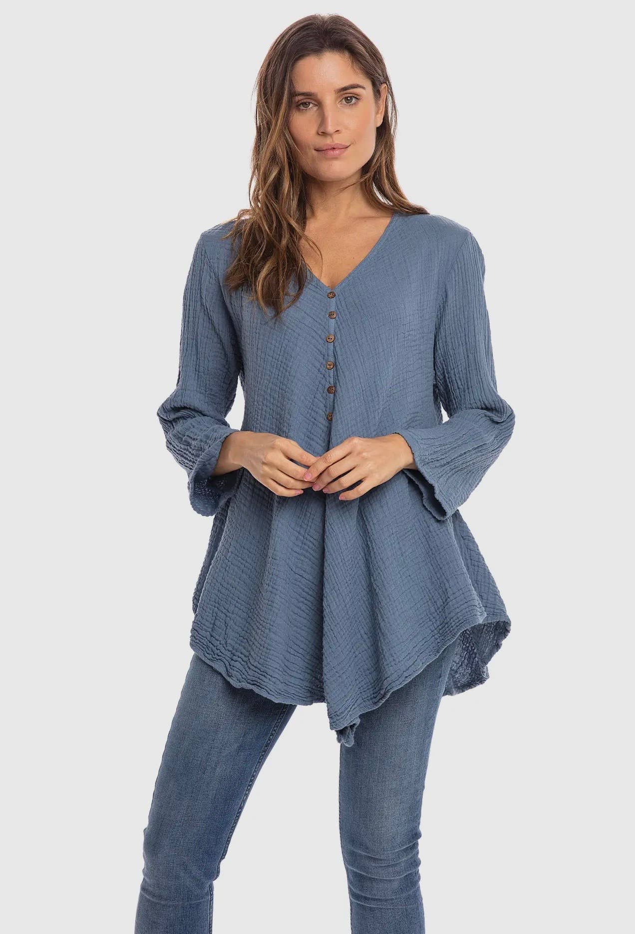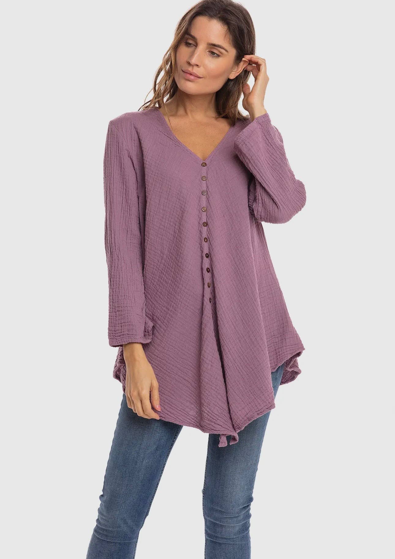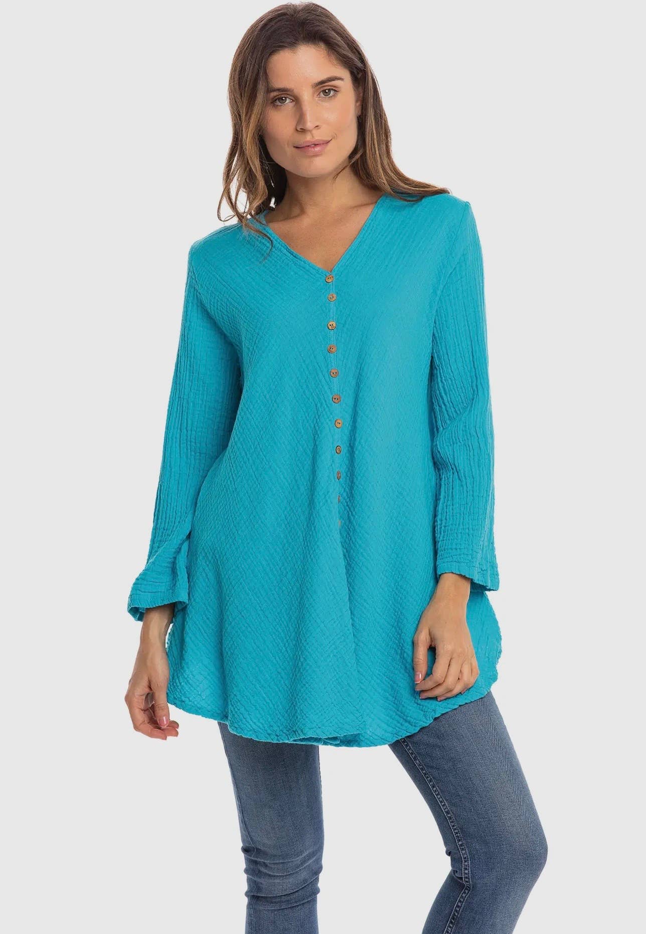 100% Cotton S/M, L/X, XXL Button Front -Does not open V-Neck 3/4 Length Sleeve Uneven Hem Line-Longer at Center Back and Front Cold Water Wash Inside Out Low Heat Tumble Dry Or Hang to Dry Handmade in Thailand