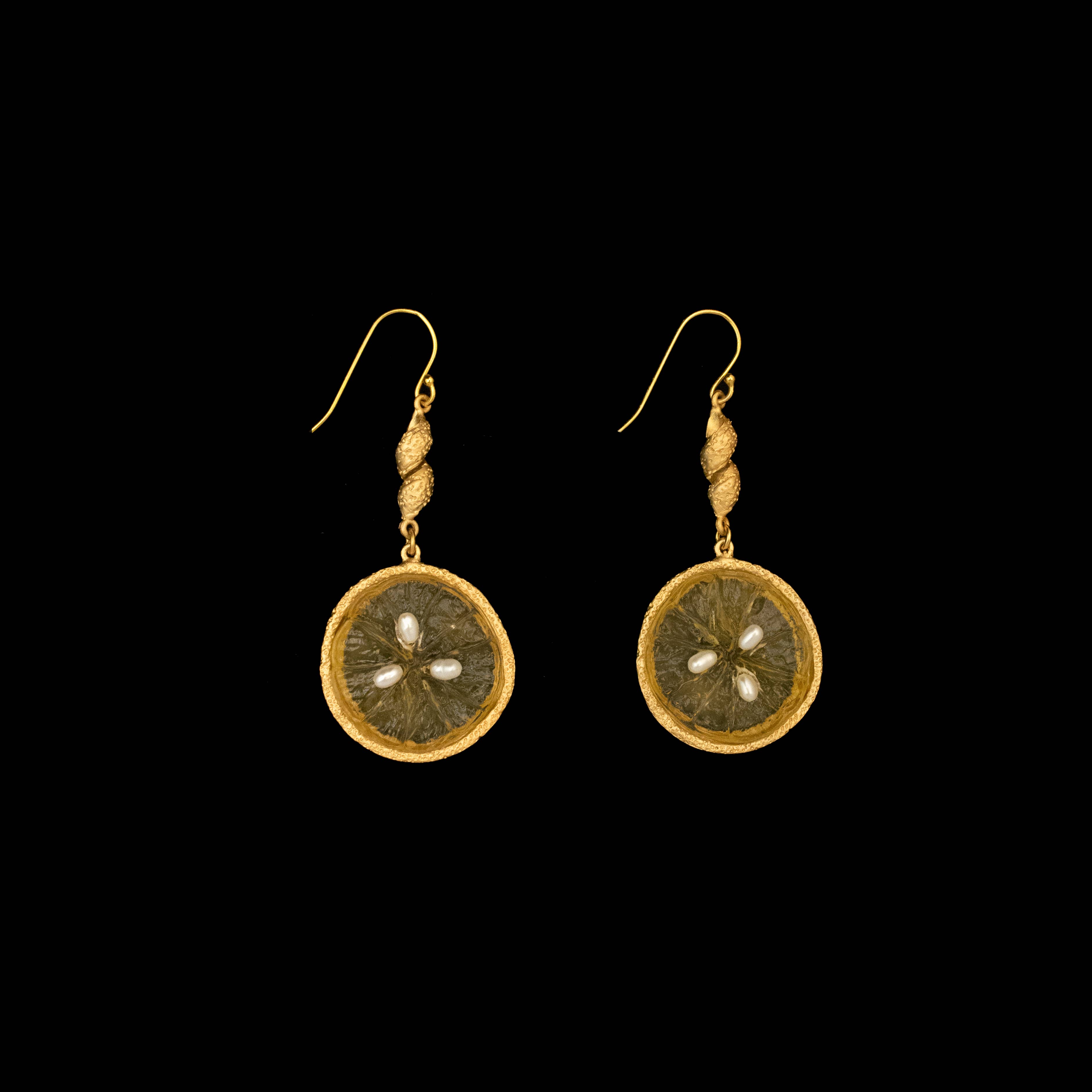 Cast bronze with a 24k gold finish. Accented with cast glass and freshwater pearls.