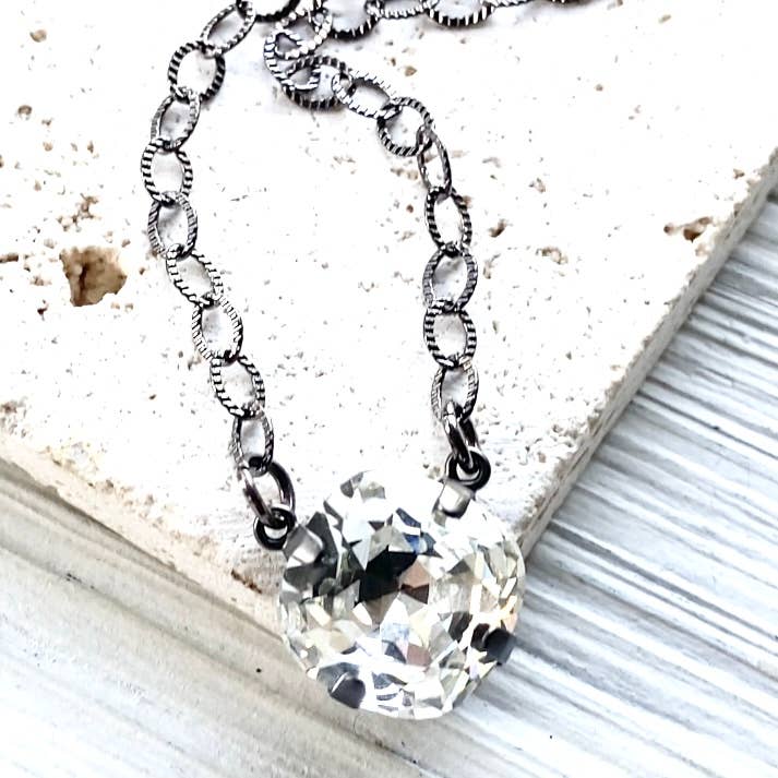 A sophisticated necklace that is easy to wear and will become a staple in your jewelry collection. Elegant and classic, pair this necklace with leggings and a tunic for a casually chic look. Gift this to the woman that loves simple and unique accessories. +Size: 32" necklace length, 1" pendant drop +Materials: Austrian crystal and cubic zirconia +Metals: silver-plated pendant, sterling silver chain and components