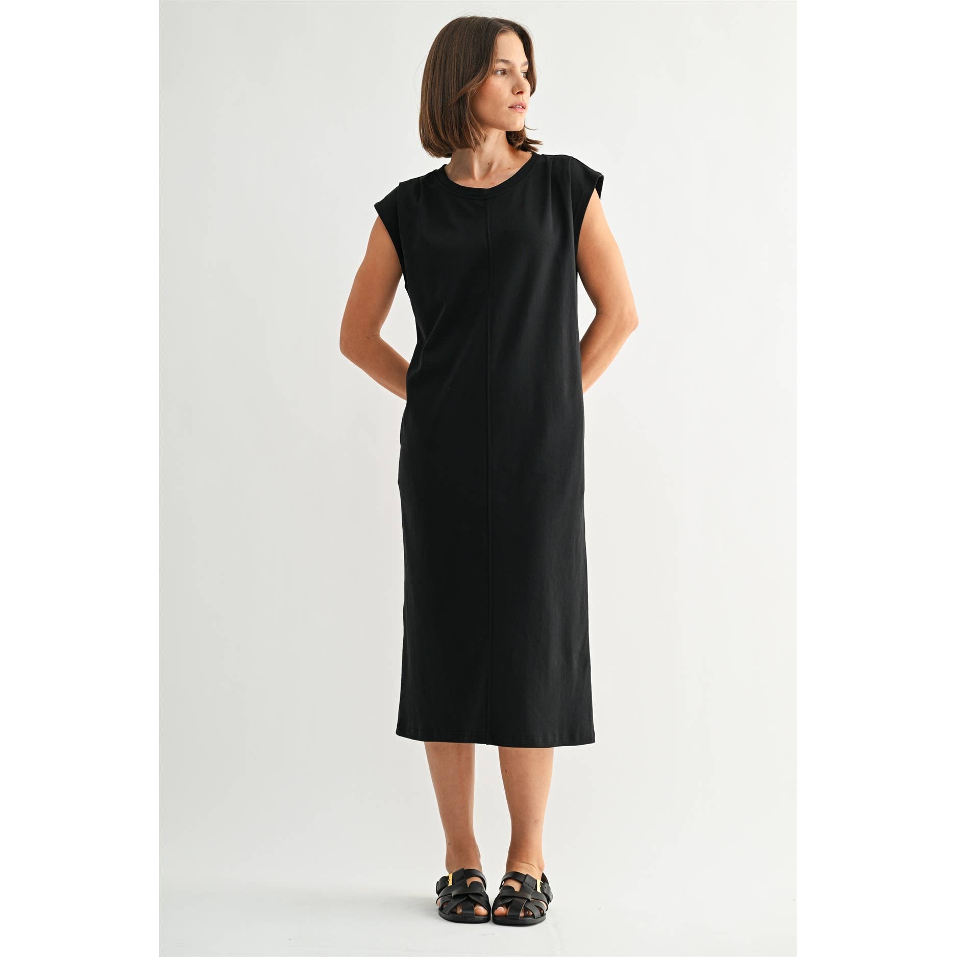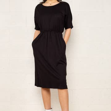 Cross back knee-length dress with side pockets. Model is 5'8" and wearing a Small. Tumble dry low or lay flat to dry.