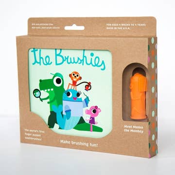Meet momo the monkey, the baby, and toddler toothbrush! The storybook brings the brushies to life and provides brushing tips. Made in the USA. BPA and phthalate-free. Non-toxic, 100% food-grade silicone. Easy to clean and sterilize. Dishwasher-safe. For ages 4 weeks to 4 years. Helps make dental hygiene fun at an early age