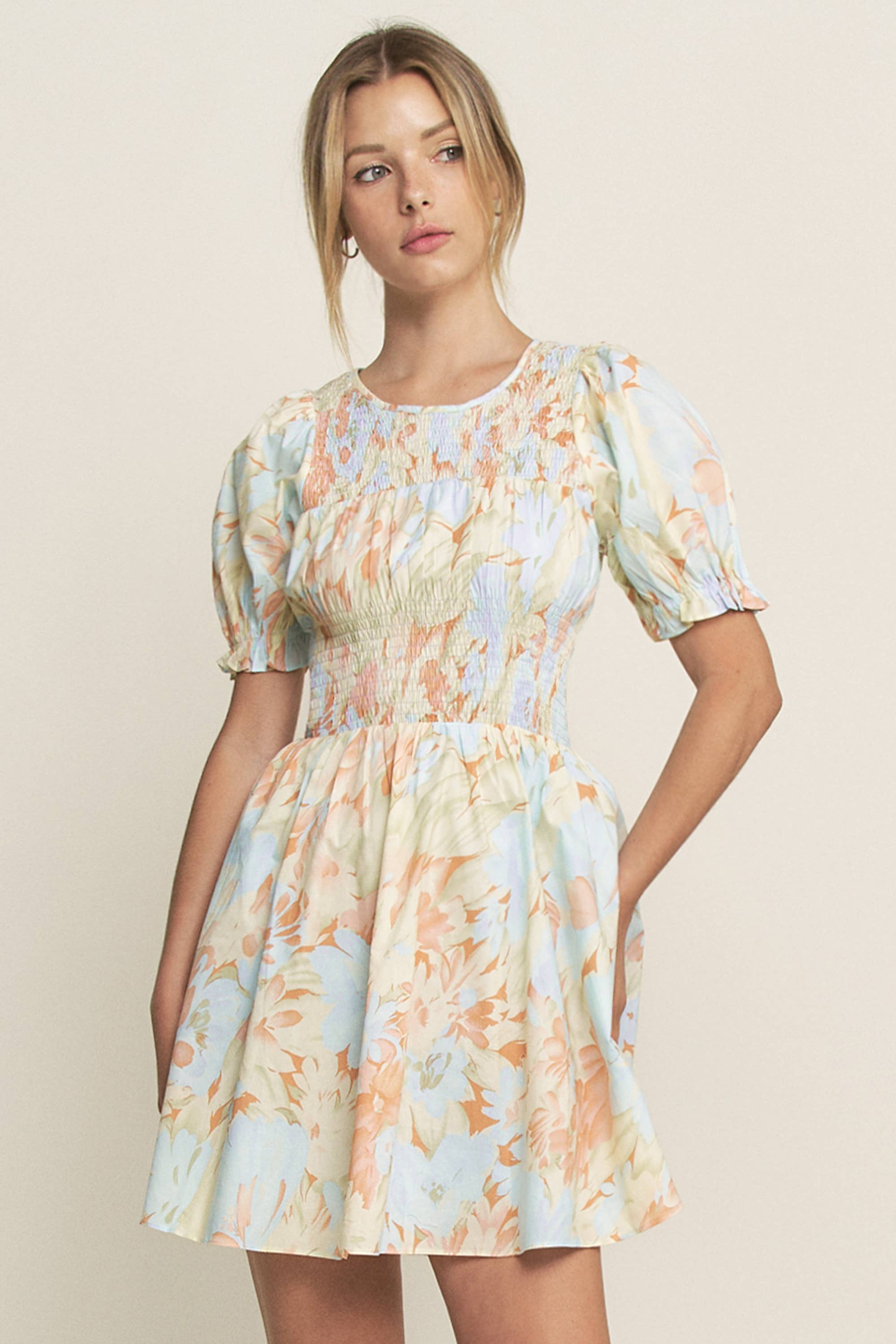 PUFF SLEEVE MINI DRESS *Step into spring with our enchanting Puff Sleeve Mini Dress. This flirty and feminine piece showcases a delightful floral print that's perfect for sunny days and warm evenings. The square neckline adds a touch of vintage charm, while the ruched details accentuate your curves in all the right places. - Square neckline - Puff sleeves - Ruched details - Mini length - Side pocket - Lined - Elastic shoulders - Non-stretchy woven
