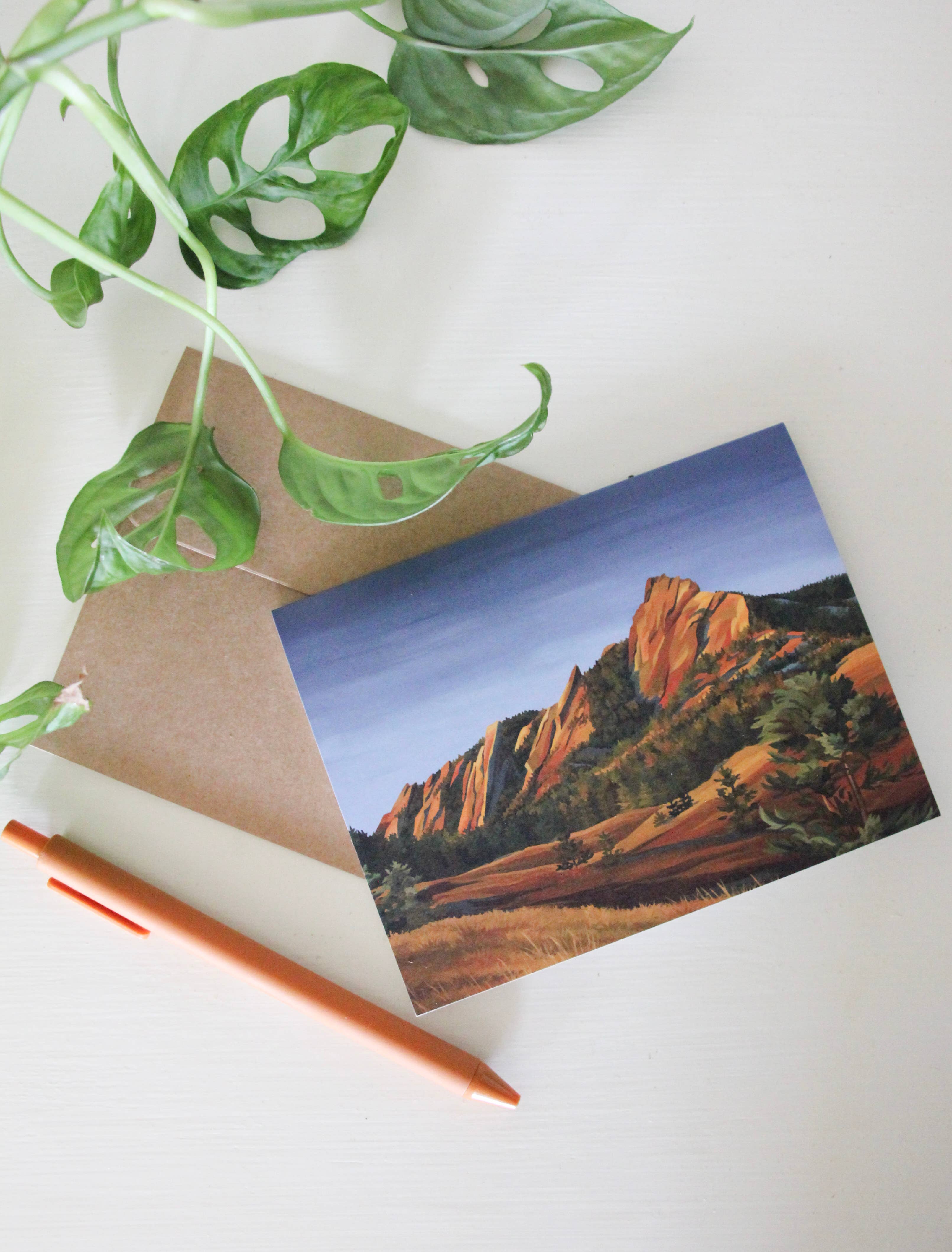 100% recycled paper greeting cards featuring the image of Fall in the Bells (Maroon Bells, Aspen, Colorado), an original oil painting. The painting is based on the magic of autumn in the Maroon Bells near Aspen, Colorado, when there is snow on the mountains and vibrant fall leaves on the trees. These blank greeting cards are high quality, vibrant, satin reproductions printed on heavy weight, recycled paper. Includes 100% recycled brown paper envelope and packaged in a plastic-free, commercially compostable sleeve. The perfect addition to a bookstore, coffee shop, or outdoor gear store!