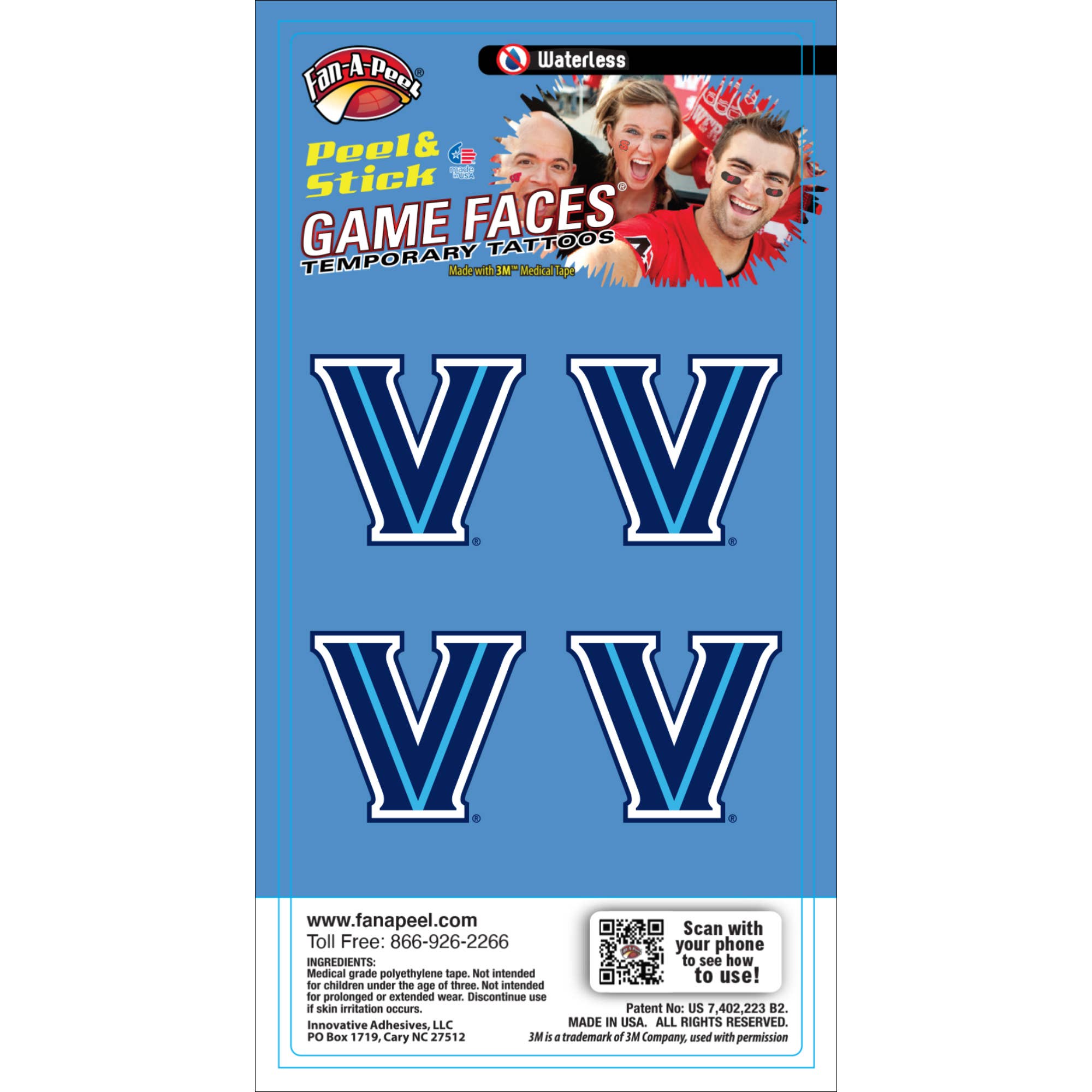 Get your game faces on! Show your game day style with game faces® temporary tattoos. Each package contains 4 waterless temporary tattoos. Tattoos are approximately 1.25" x 1.25" and are printed on clear, 3m® brand, hypoallergenic, medical tape.