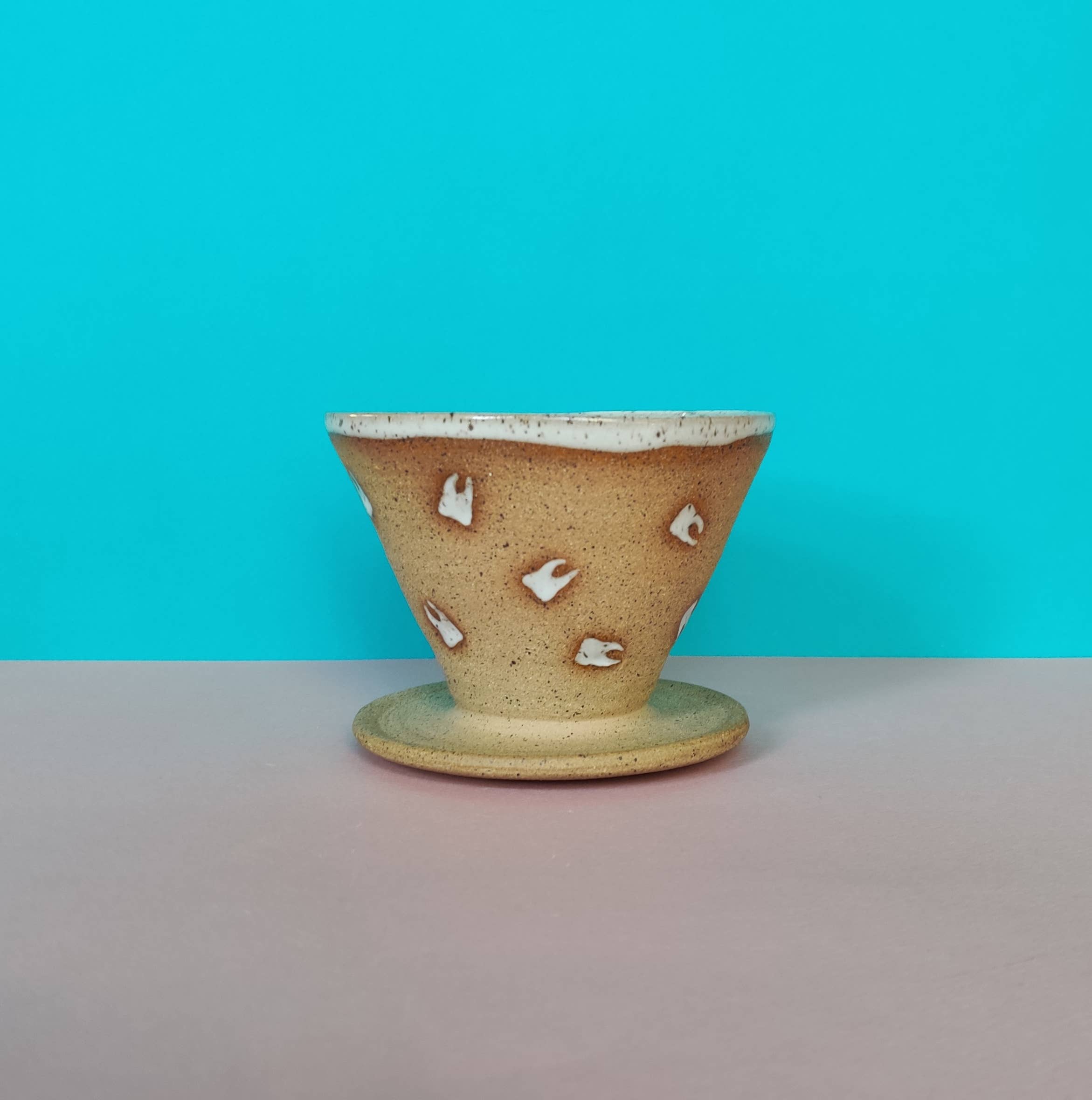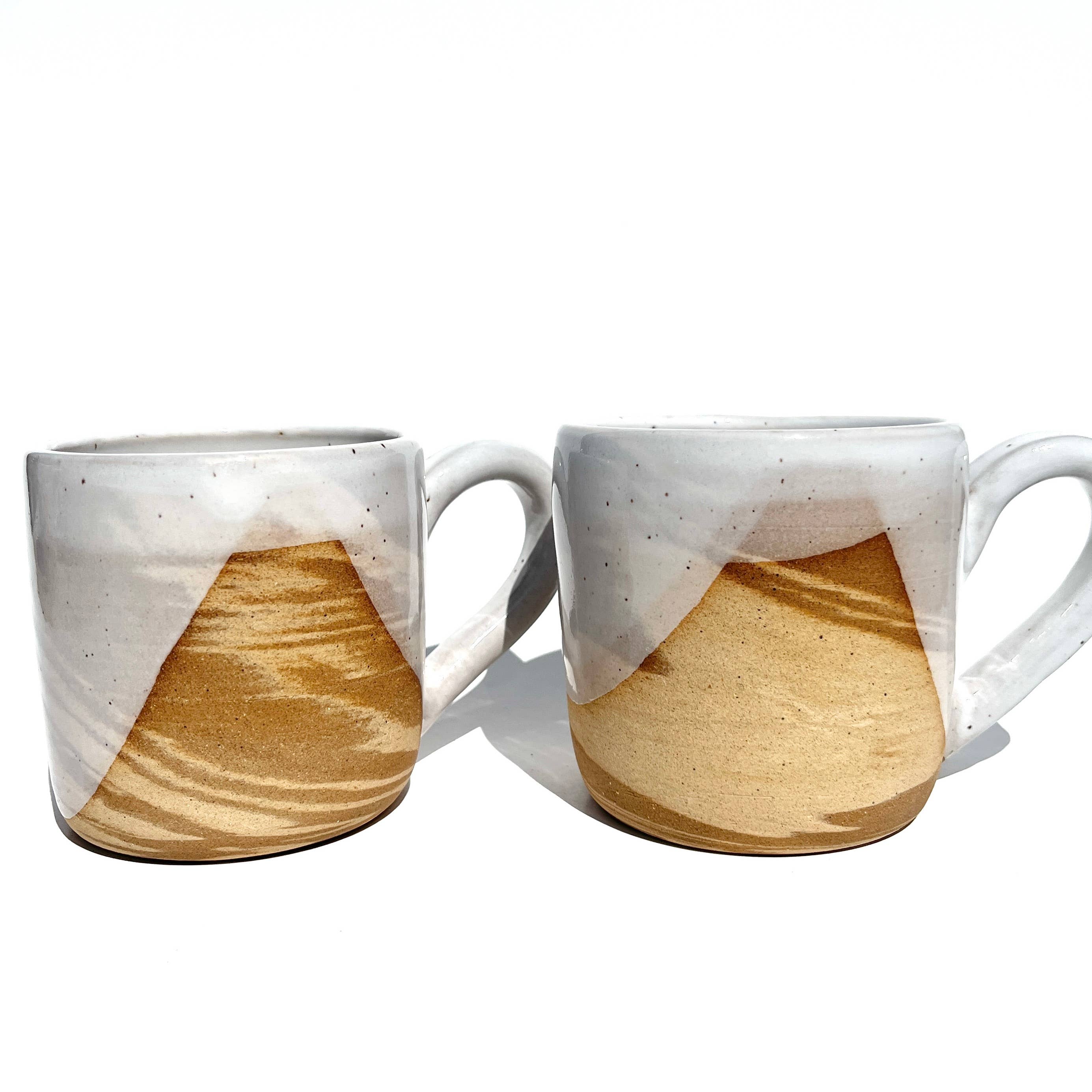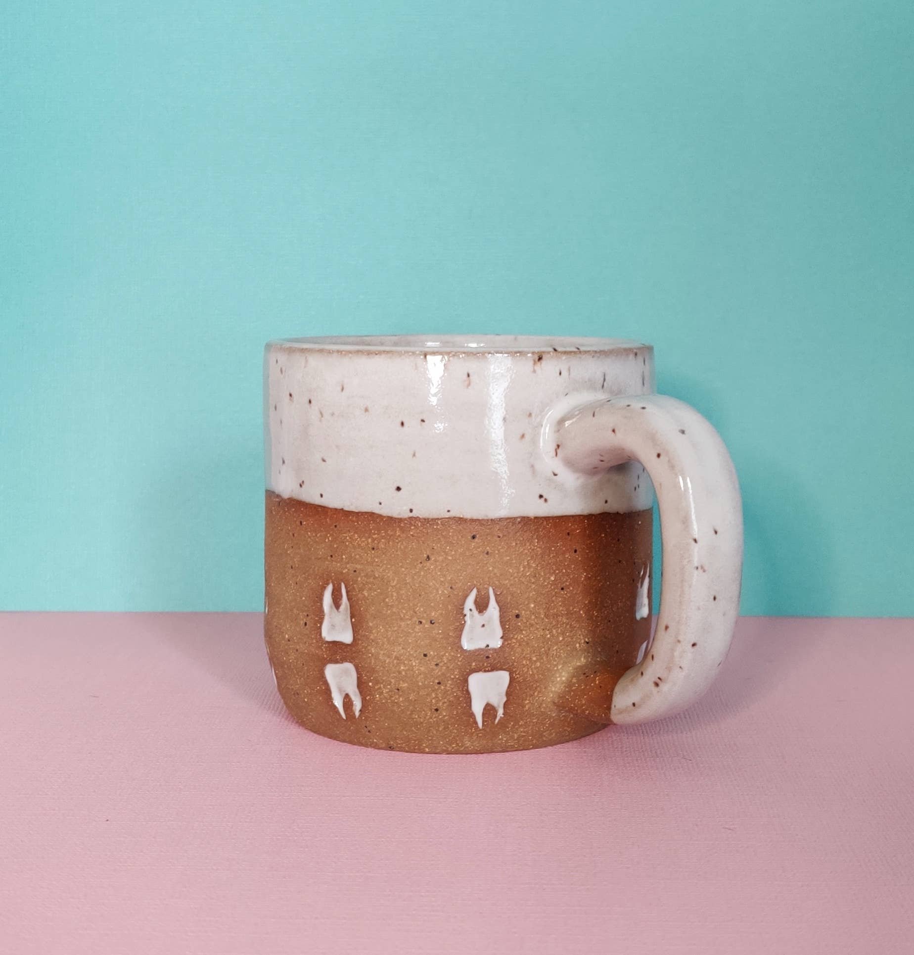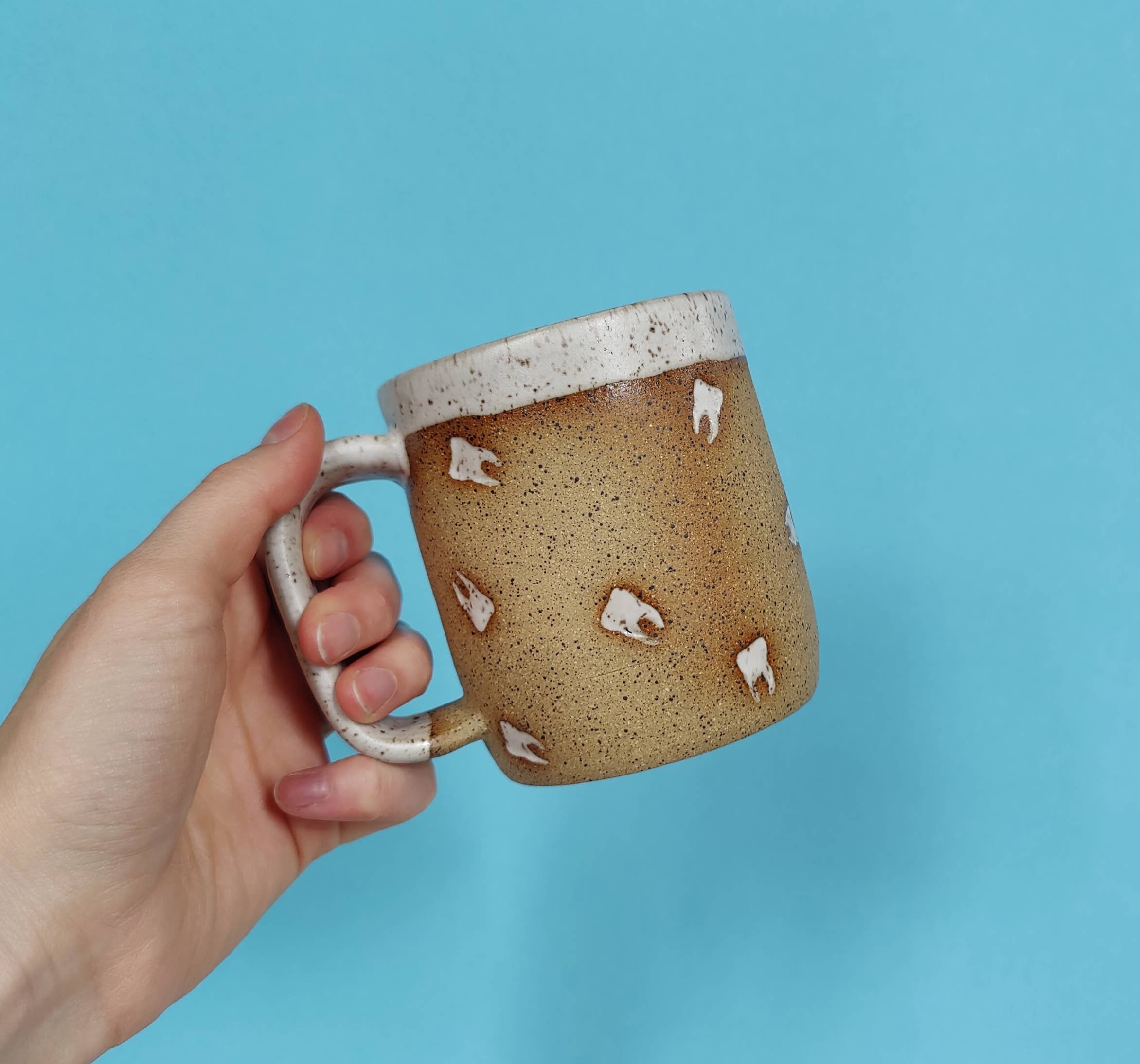 Stoneware mug, thrown on the wheel and then stamped all over with my hand carved tooth stamp in a random pattern. Inside, lip, teeth, and handle glazed a satin speckled white. Size guide: While some variation can be expected with handmade items, the sizes generally are: 8oz mug is 3 inches tall, 3 inch diameter. 12oz mug is 3.5 inches tall, 3 inch diameter. 16oz mug is 4.5 inches tall 3.5 inch diameter. Care Instructions : Dishwasher and microwave safe