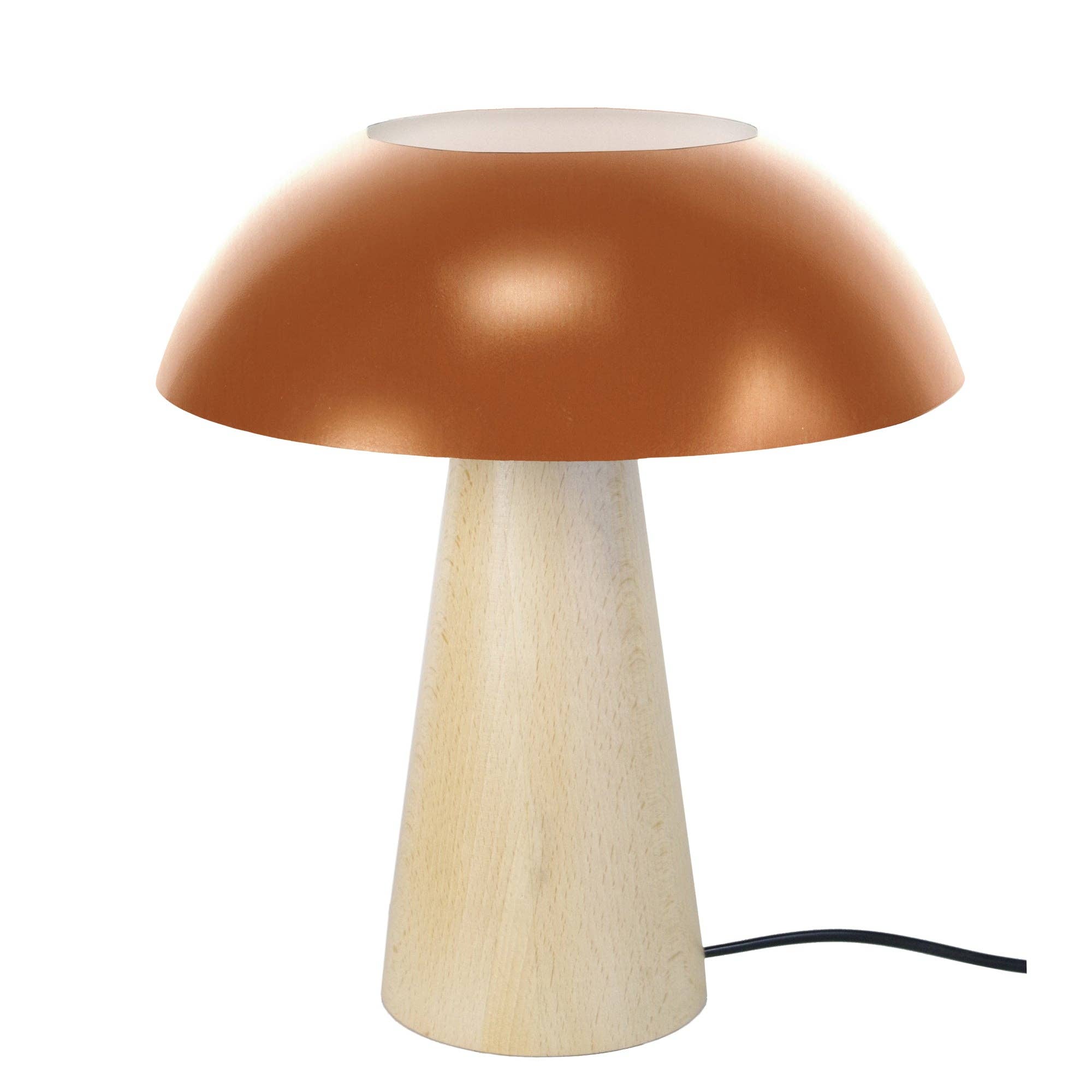 An original look with a contemporary style for this table lamp that beautifully combines French beech wood from eco-sustainable forests and recyclable metal with epoxy paint, guaranteed longevity, this is the lamp you need for your desk, bedside, entrance or other places in your home where there is a table. Bowl-shaped copper-colored steel lamp shade E14 socket x1 light Bulb not included recommended: 7W LED (halogen, max. 40W) G11 golf ball type Downward light projection Electrical network connection: type C (Europlug) or type G (UK) electrical outlet Switch on the electrical cable Nordic-inspired style Protection class II Protection class: IP20 Dimmable, dimmer not included Operating voltage: 230V Power supply: 230V Lampshade dimension: Height 10.5 cm x Length 15 cm x Width 15 cm Overall dimensions: Height 42cm x Length 25cm x Width 25cm Product net weight: 1,6Kg