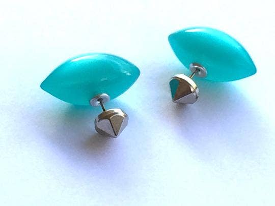 2 sided earrings. Why only be interesting on one side of your ears? Lucite by nature is a really light-weight, so you can wear something bold & elegant, & it won't weight you down. These have on the front a lime green feature with what looks to be a hand painted coating over the lucite in 12mm - then we meet with some in the back & front, & deep brown moonglow back,material. So these trendy pieces are not only lovely, but comfortable to wear.Front piece measures about 11x16mm in diameter or so, and back is about 14mm. But see the last picture to get an idea of scale & how they will look on you. All of Leetie Lovendale's 2 sided earrings are mix-and-matchable. Share backs with any of your studs or posts you purchase from us. And you can even put them in your ear backward for a reversible look. Earrings electro-set by hand & made with vintage lucite parts that were made in Rhode Island in the 1960's - early 80's by Best Plastics.