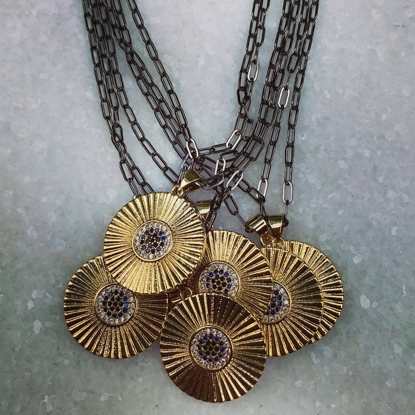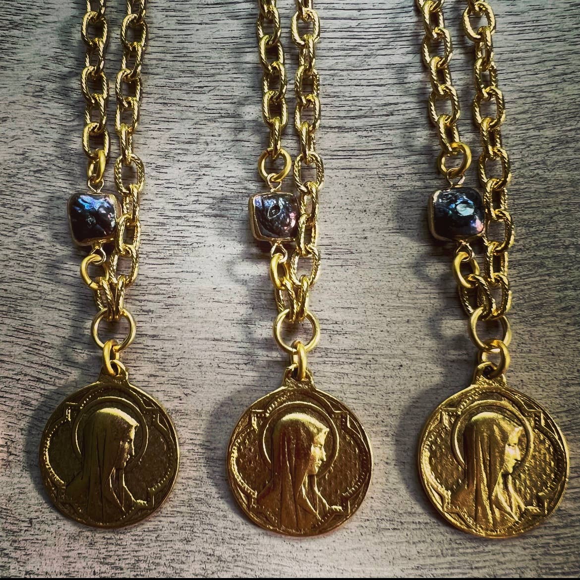 Gorgeous necklaces made with copper new and vintage components, listed below from the photo, left to right: 1- XL lobster claw on 17.5” copper flat oval chain with 2” aged brass stamping of boot 2-wired labradorite teardrop 30x20mm on 17” copper curb chain 3- XL 42mm Joan of Arc double sided coin on 20” copper rutilated quartz with toggle 4-XL 42mm Joan of Arc double sided coin on 23” copper wired 6mm glass pearls 5-vintage detailed copper St Christopher medal on 22” cable chain 6- tiny copper 16” chain wth tree of life 1.5” drop 7-hand made suede tassel with rhinestone cross, glass drop and vintage brass rings tied in on 28” rolo chain with 10” tassel drop 8-vintage medal of infant Jesus on 30” cable chain 9-connected angel wings with chain drops on 17” tiny cable chain 10- vintage crystal chandelier 5.5” drop with wing stamping on 26” sattelite chain **This is limited edition, one-of-a-kind, no restock