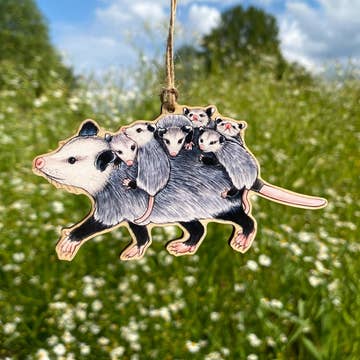 Mom Opossum with Babies Wood Print Christmas Ornament