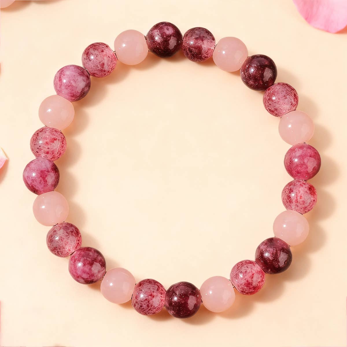 Rose Quartz and wood beads strung on stretchy cord help to bring healthy and healing energy into your life. Fits wrist sizes 6.0 inches - 7.0 inches. Strung on durable stretchy cord. Bead size 8mm. Comes on display card for a great gift!