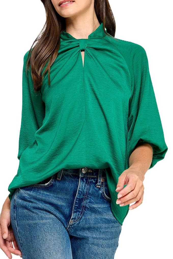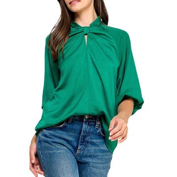 Made in USA Satin Vibrant Cowl neck 3/4 Sleeve Top. Fabric content: 97% Polyester, 3% Spandex. Available in other Colors. SIZE & FIT Raquelle is wearing a Small Height: 5'9 Waist: 26 Bust: 34C