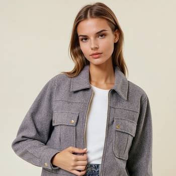-TWEED WOVEN FABRIC -COLLAR DETAIL -BUTTON CLOSURE FRONT -POCKET DETAIL FRONT -LONG SLEEVE WITH CUFF BAND -CROP LENGTH STYLED WITH: M43241, M70580 MODEL IS 5'8" AND WEARING SIZE SMALL # fall, winter, outerwear, jacket, blazer, collared, pockets, buttoned, shacket, cropped, back to school, party, holiday