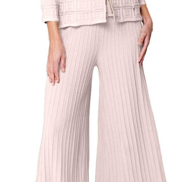 Wide-Leg Loose-Fit Pants; Flat Knit; Full Length; Viscose blend; Material: Finest Italian Yarn 88% Viscose 12% Stretch Polyester Sizes: XS —XL Care: DO NOT dry clean. Hand wash in cold water with mild detergent and spread flat in original shape to dry.