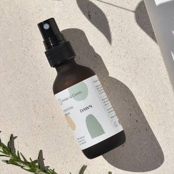 Energizing, uplifting, clean. Inspired by the mist of dawn, an herbal blend of Rosemary, Frankincense and Eucalyptus helps refresh your clarity and open channels for positive energy. Made with 100% natural ingredients and a custom blend of 5-10 essential oils chosen to add botanical benefits and light moisture when used on skin. Multi-purposeful and alcohol free. Mist above and around your face and shoulders or directly on body, neck or hair throughout the day. 2oz glass. Made in San Francisco.