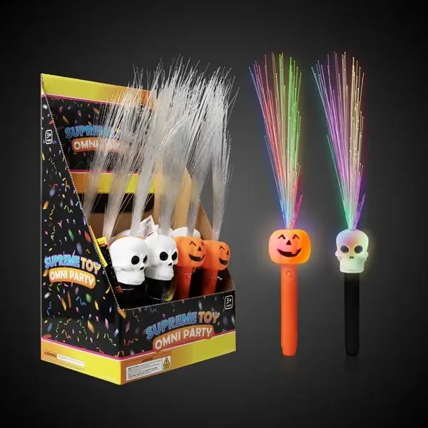 Halloween Ghost Pumpkin Skull Head Spinning Colorful Rainbow LED Light-Up Novelty Glow Stick Wand -Wand Dimensions: 14.5 * 3" * 3" -Fan Diameter: 5.5" (Head Rotates 180 Degrees) -Assorted Design (5-Ghost, 5-Pumpkin, 2-Skull, May Vary) -On/Off switch requires 3 x AA Battery (Pre-installed, Please remove the pull-tab before use) -100% Plastic -CA Prop 65 Advisory -Packaging Details: Individually wrapped in clear poly bag, then as whole in clear OPP bag. -Light up your Halloween with these spooky LED Light Spinning Wands! Featuring eerie characters like ghosts, pumpkins, and skulls, each wand dazzles with a glowing base, color-changing lights, and playful sound effects. The pinwheel rotates a full 360 degrees while the wand body swivels 180 degrees, adding dynamic motion to the festive fun. Perfect for trick-or-treating, costume parties, or nighttime parades!