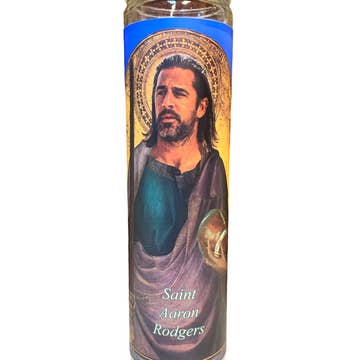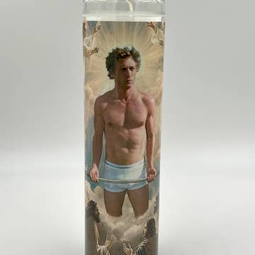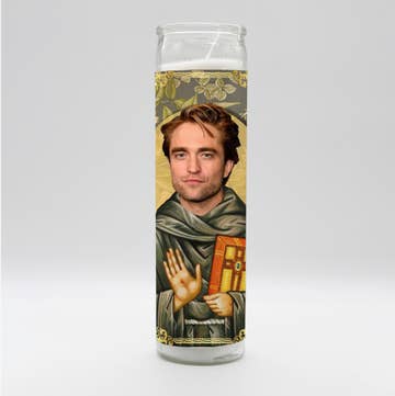 Tall white candle, hand poured in Mexico, design and assembled in the USA. Candle is unscented. Robert Pattinson inspired parody art prayer candle.