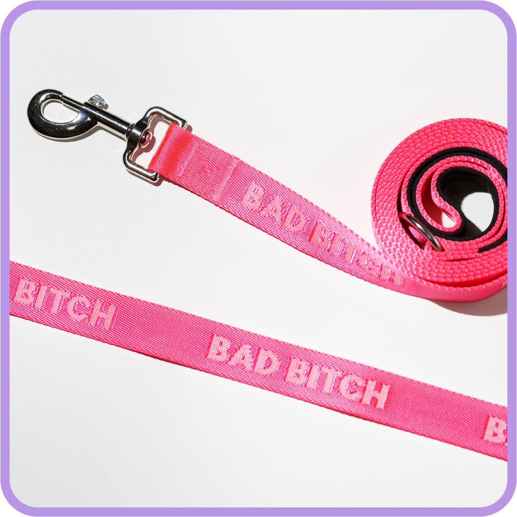 the perfect leash for the dog who greets everyone so you don't have to. Leashes that speak dog. 1” wide nylon webbing. 6’ feet of snarky fun. Features padded neoprene lining in handle! 1" wide nylon webbing 6' length text repeats down length of leash