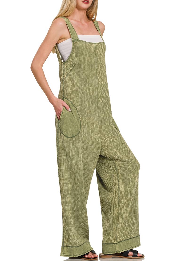 Adjustable straps wide-leg patchwork cotton jumpsuit with chest and side pockets