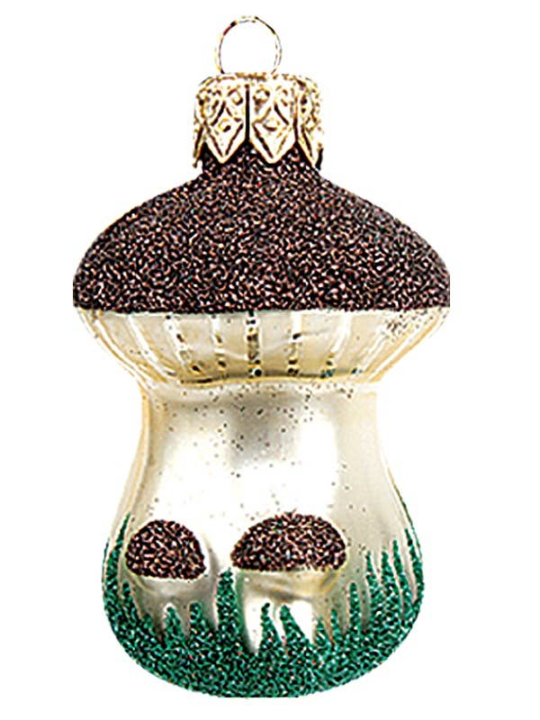 Pair of Brown Mushrooms Ornament. Handcrafted in Poland. Hand-painted by Polish artisans. Made from mouth blown glass. Approximately 3 inches tall (8cm).