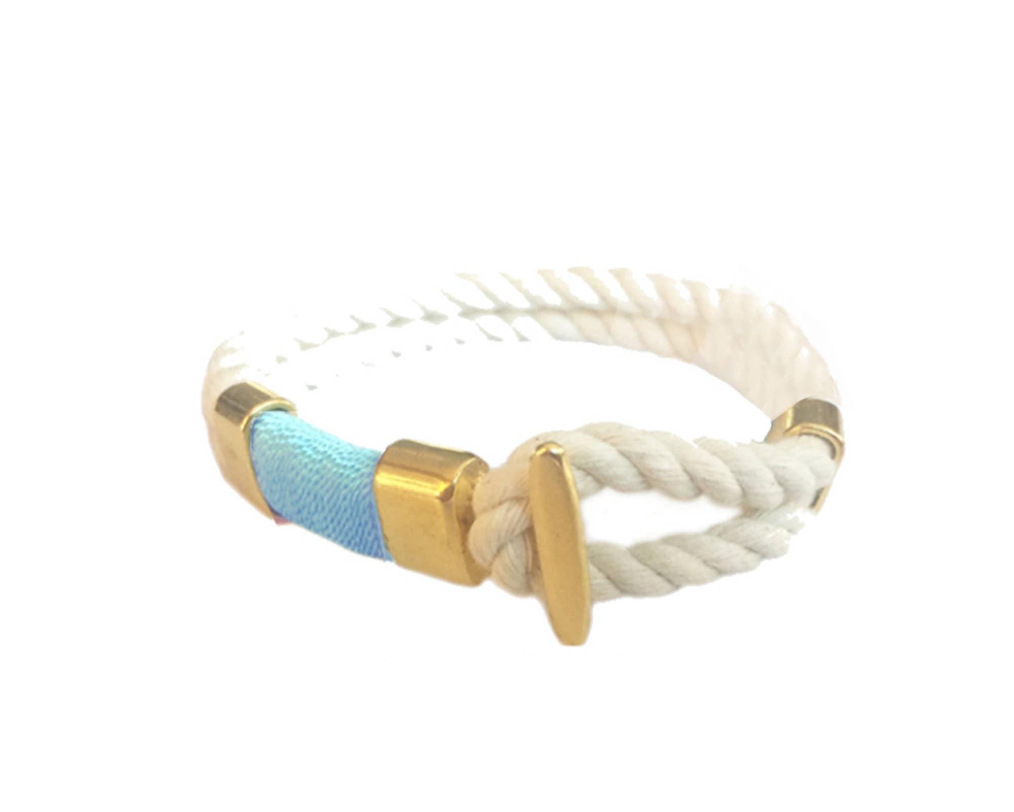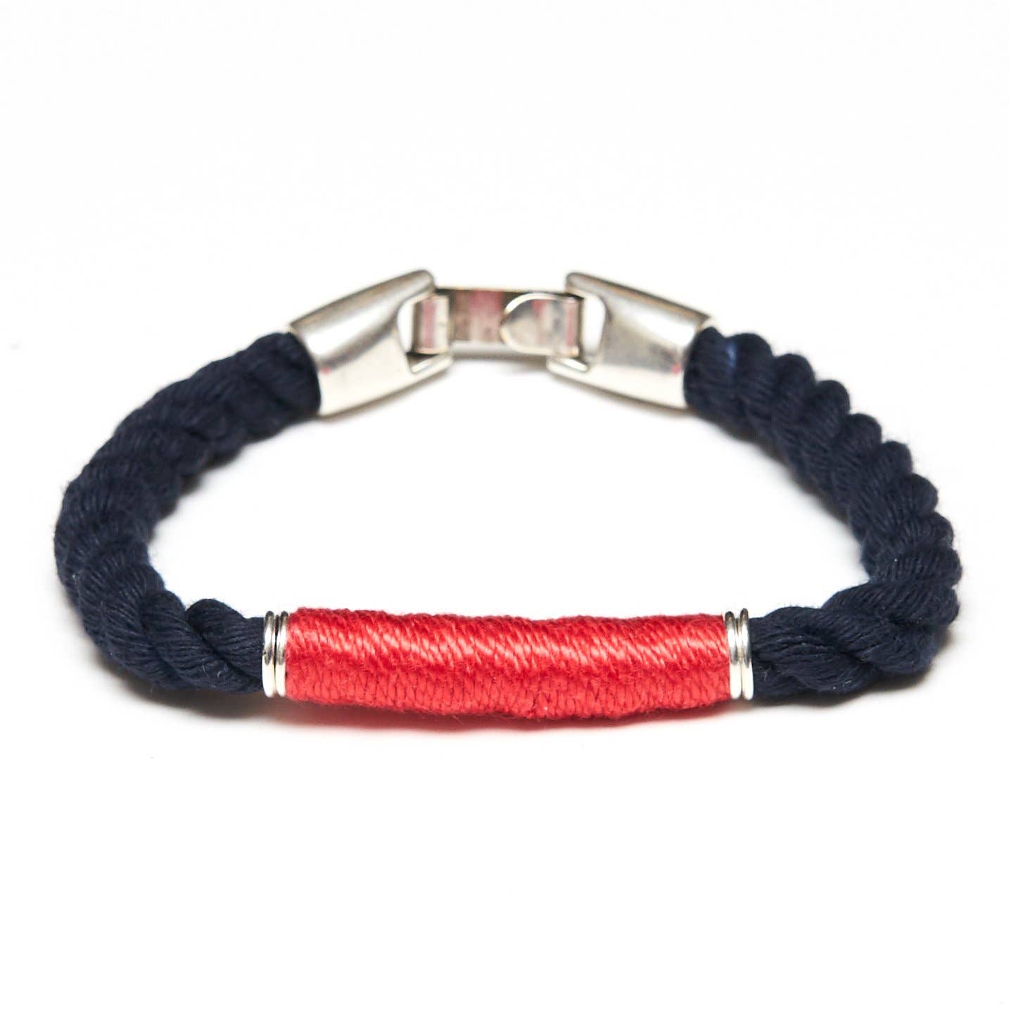 Natural ivory cotton rope. Silver plated clasp closure. Silver plated spacer beads. Hand wrapped yellow, white, and blue thread detail. The size conversions are as follows: XS = 6.5" S = 7" M = 7.5" L = 8" XL = 8.5" The most popular sizes for women are size S and M, while for men L and XL. Category: Nautical Jewelry / Nautical Bracelet