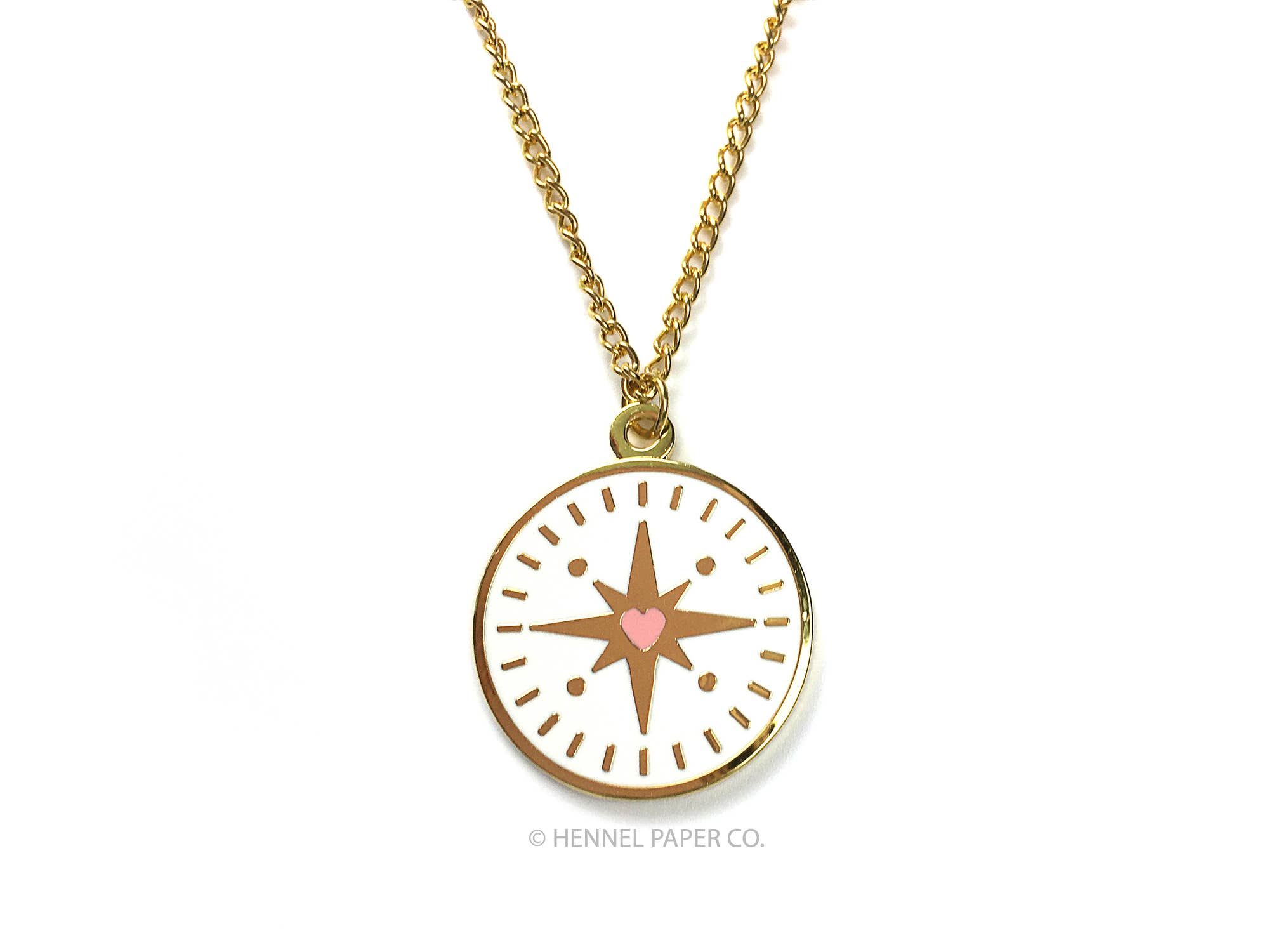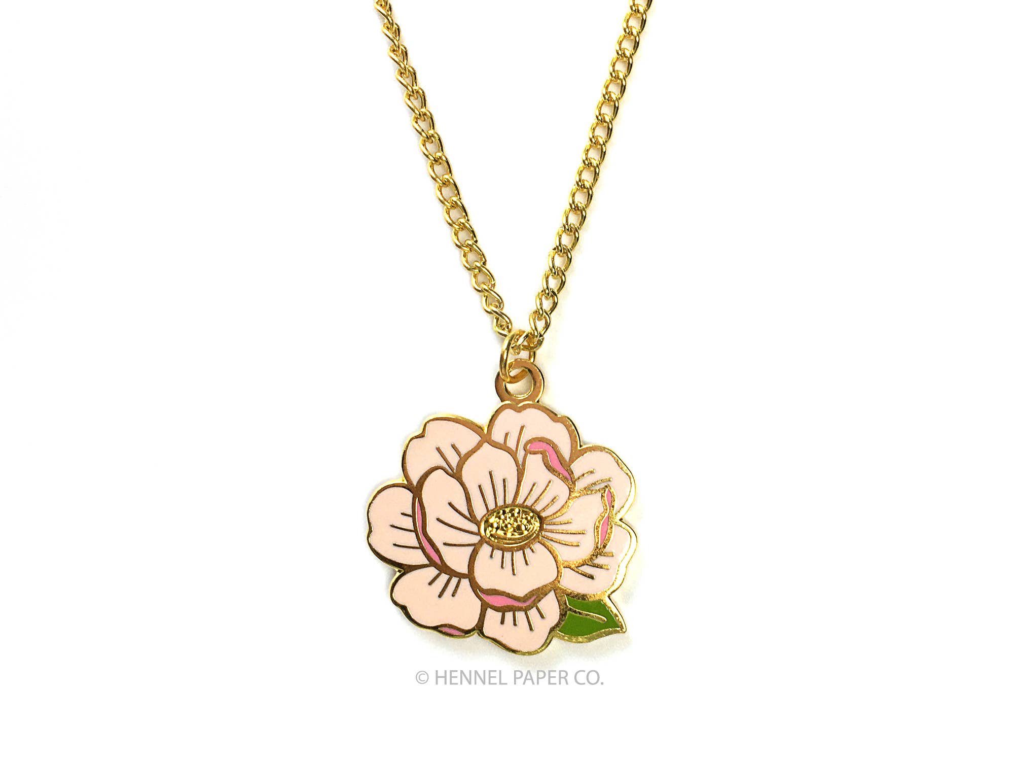 • Measures aprox. 1" at its tallest point • Gold plated finish • 18” chain • Hennel Paper Co. logo on the back • Packaged on heavy backer card & sealed in a 4bar size clear poly bag with hole for hanging
