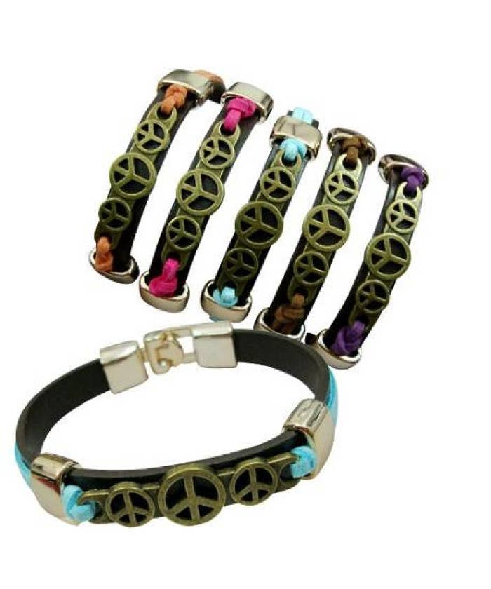 One-size-fits-all. Seriously, just bend and shape to suit any wrist. Made from real guitar strings. Don't get 'em wet! Approximately 9 inches in wrap length, 0.14 in width and weighs 0.04lbs. Peace Charm is rhodium plated brass and measures 1 inch in length.