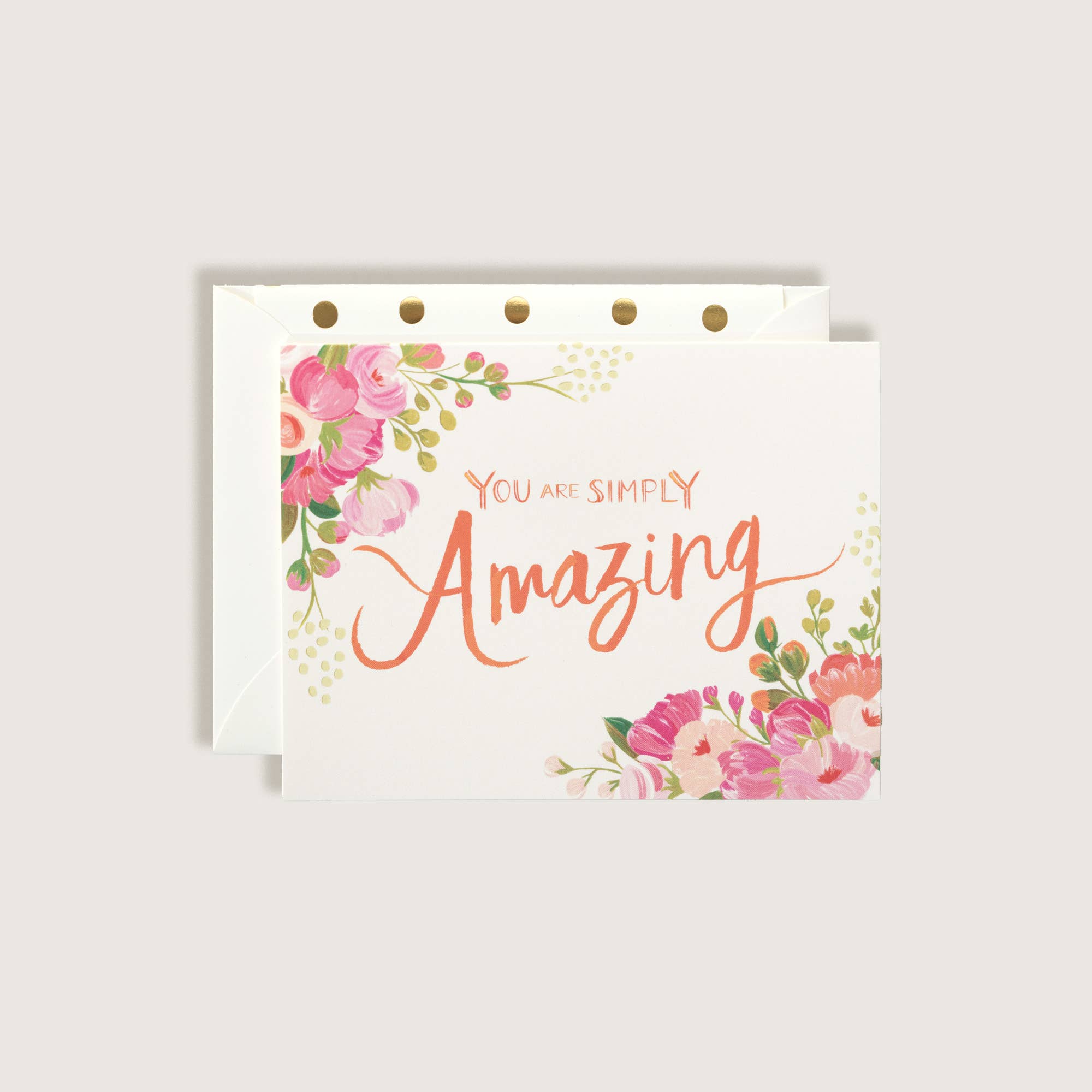 Illustrated with a postage stamp shaped border. Colors are blush peaches and green. Text in Black. A2 Card. 5.5 x 4.25 folded. Cream card stock. Cream Envelope. Blush liner with gold foil polka dots. Cello sleeve provided.
