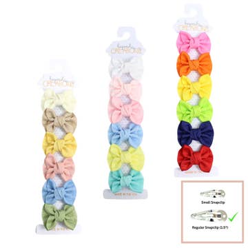 This sturdy bow measures 1.75". Perfect for little ones who need their hair pulled back or older children who like a small clip and a little color in their hair. The box includes 6 bows. The suggested retail price is $18.00. The metal clips we use are steel and strong, with great tension. They are tested in a US laboratory and are CPSIA compliant.