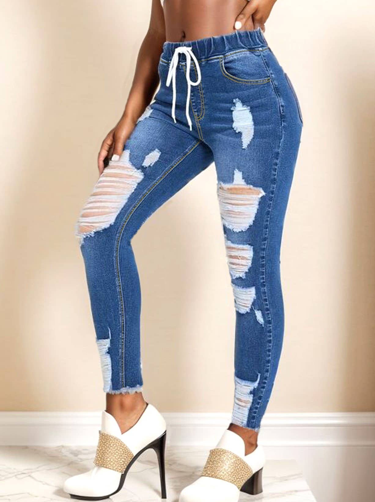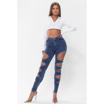 HIGH WAIST CUT OUT DISTRESSED JEANS - BUTTON WAIST CLOSURE - CUT OUT, DISTRESSED DENIM TRIMS - SKINNY FITTING SIZE 3 : WAIST - 26 INCH, INSEAM - 29 INCH *JUNIOR SIZING IN GENERAL IS MORE FITTING AND SITS TIGHTER AVAILABLE IN JUNIOR AND JUNIOR PLUS SIZING IMPORTED, DESIGNED IN USA *FOR DETAILED SIZING SPEC, PLEASE MESSAGE OR CALL US BEFORE PURCHASE!