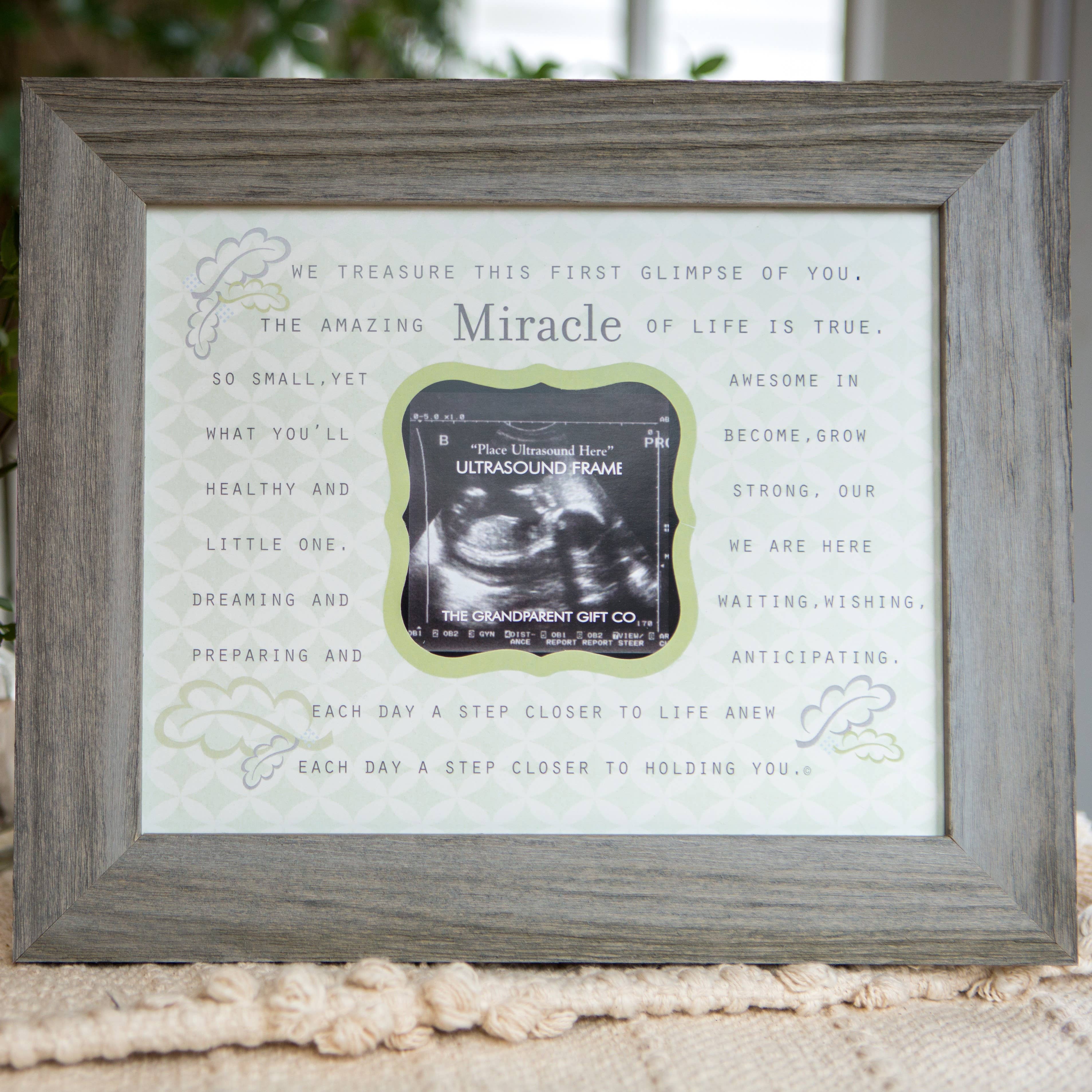 Our most popular ultrasound sentiment for grandparents. Your Little Grandbaby poem, written by Teri Harrison is sure to delight any expectant grandparent. A wonderful way to announce a pregnancy, that will surely draw screams and tears from excited grandparents-to-be. Our new modern frame for today's grandparents features whimsical hearts and a sweet, simple design to high grandbaby-to-be's ultrasound. Our 4x6 white double tabletop frame holds the sonogram and new baby poem. Share the news with grandma and/or grandpa today! Product Features: Little Grandbaby Ultrasound Poem • 4x6 white tabletop frame • Space for sonogram/ultrasound photo Poem Copyright, Teri Harrison