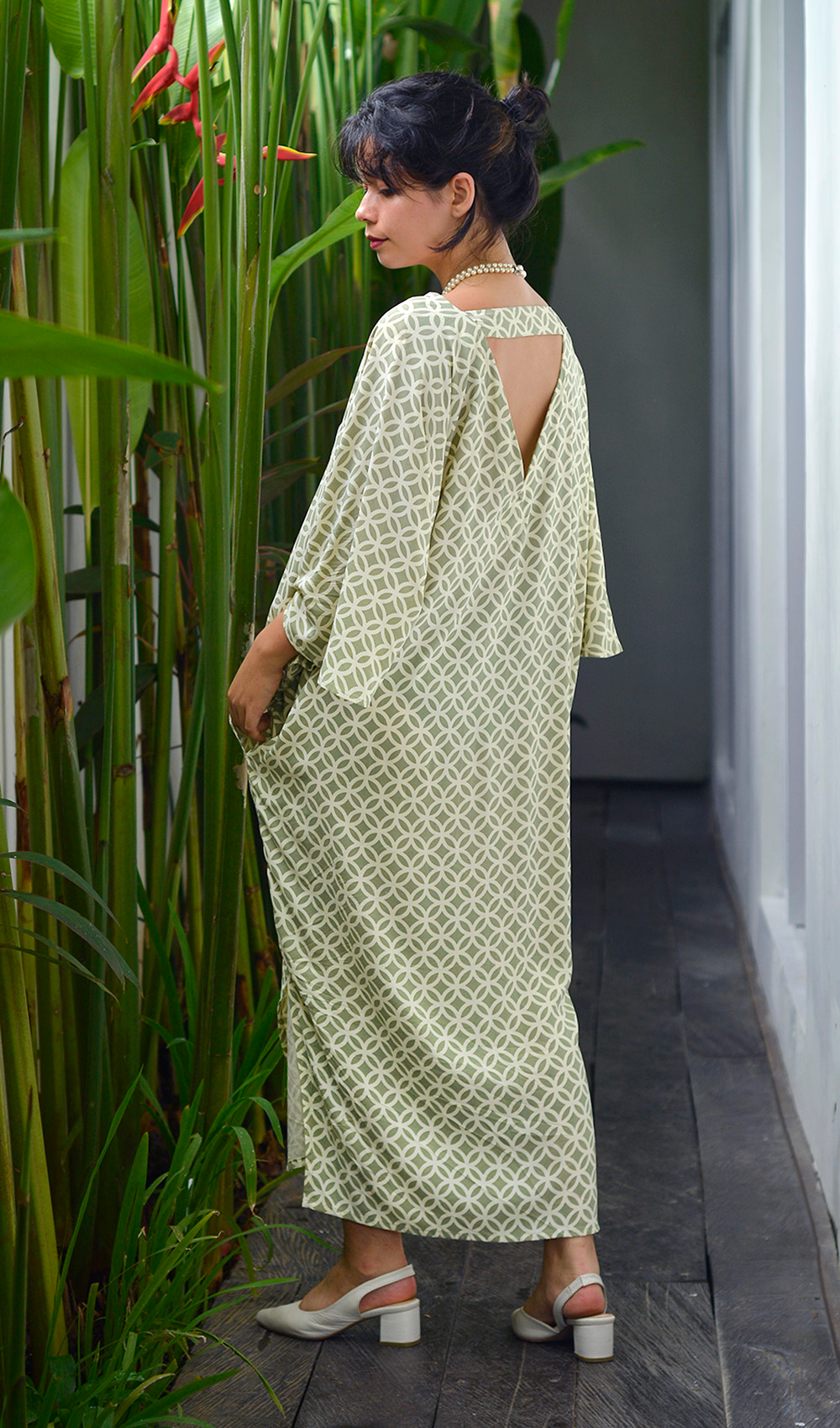 One size fits all 100% Rayon — Hand or machine wash cold, tumble dry on low heat or line dry USA Shipping cost: 10%-15% — includes duty and handling All other locations: shipping 15% — duty not included ~~~~~~ Our one-size kaftan dress, made with a luxurious rayon, is perfect for every occasion - lounging at home or the beach, or going out to lunch or dinner. It's cut and drape with pockets make it very elegant and comfortable. It is hand silkscreened in one of our original, nature-inspired Balizen prints with an eco-friendly, seaweed based dye, and was made with care in our fair trade, in-house workshop in Bali. Andrea designs each of our relaxed, versatile pieces to be part of a classic, timeless, minimalist wardrobe. Pictured on Saras • Size 2 US (XS) • Height 5’5” (164cm)