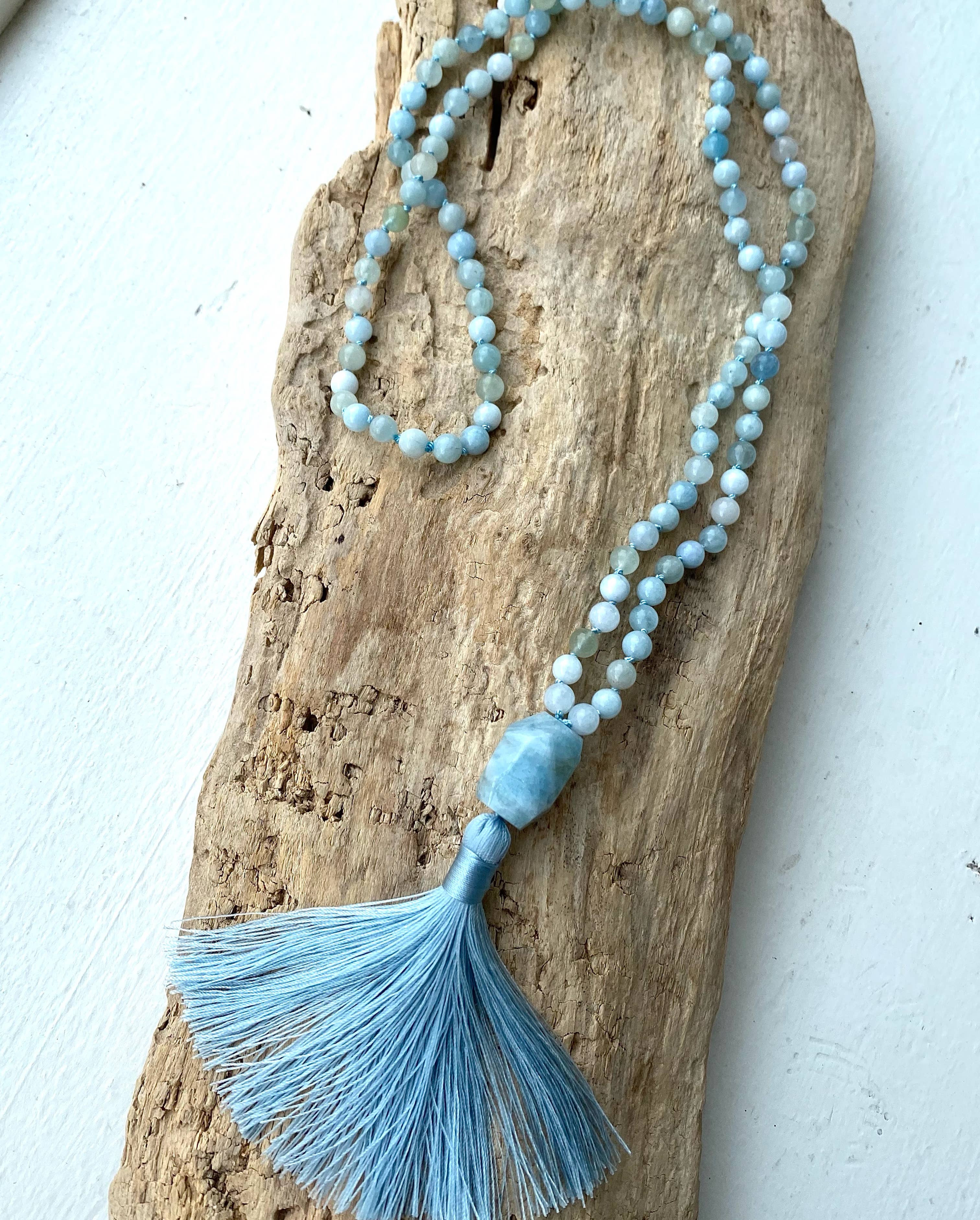 Knotted mala of 108 beads is made of premium labradorite gemstone beads. These high-grade beads have a natural schiller and prominent iridescence known as labradorescence. Beads measure 8 mm each. Premium knotted gemstone mala High-grade labradorite gemstone 108 gemstone beads, additional guru bead Beads measures about 8mm each Due to the nature of gemstone, each mala will feature natural variations in color, bead details, and overall appearance. Tassel color and details may vary.