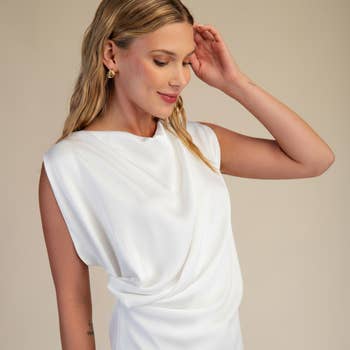 One shoulder top with cape and one shoulder tank lining. Fabric: Venezia Care: Machine wash hand to dry or dry clean for best results. Size Chart: Xs - 0 - 2, S - 4 - 6, M - 6 - 8, L - 8 - 10, Xl - 12 - 14.