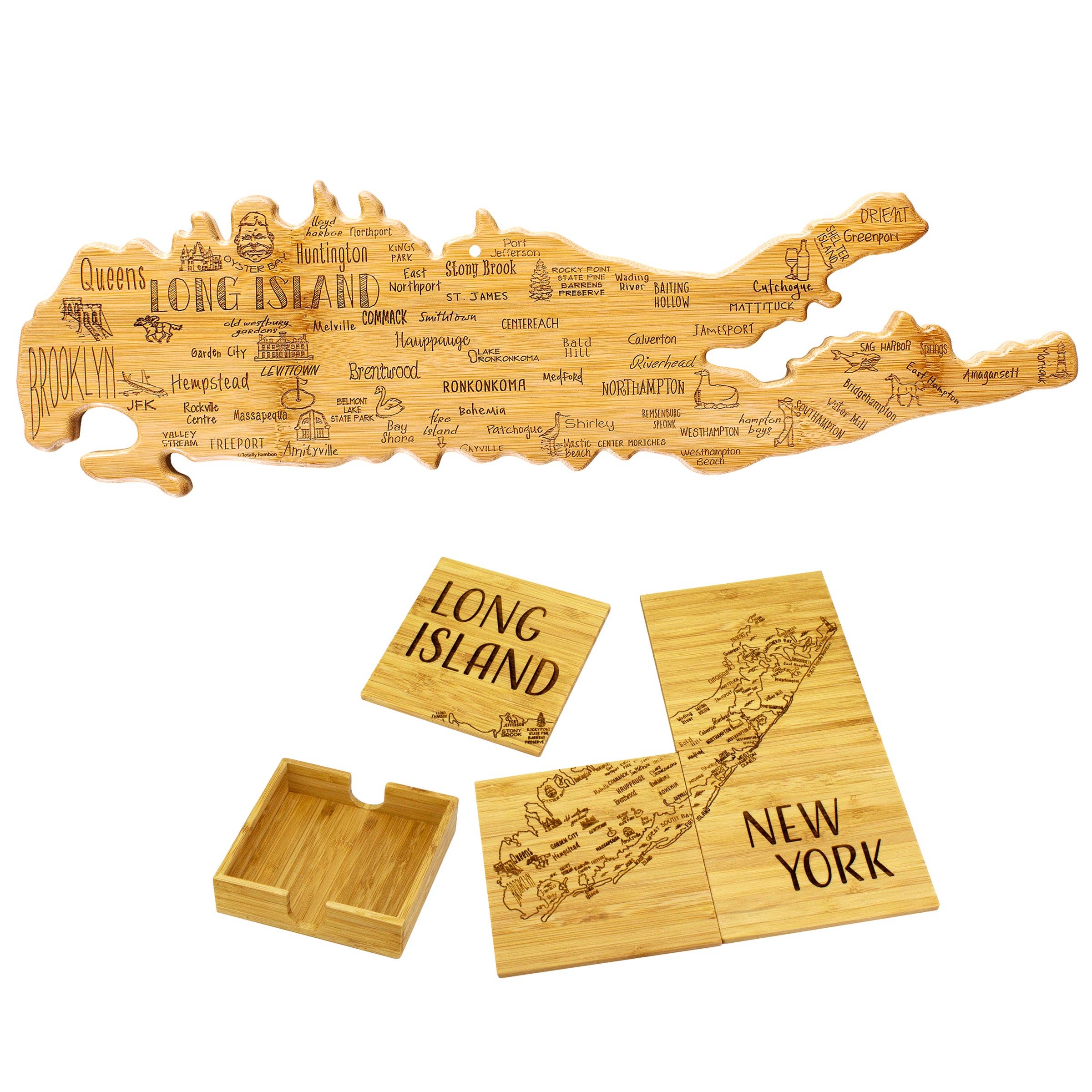 Celebrate Long Island with this beautifully crafted bamboo cutting board! Shaped like the island, it features laser-engraved artwork highlighting the iconic towns, landmarks, and sights that define Long Island. Shoppers love using it as a fun, conversation-starting charcuterie board for serving crackers, cheese, meat, fruit, candy, and other favorite snacks. The blank reverse side offers all the benefits of a bamboo cutting board: a durable, lightweight, and knife-friendly cutting surface. Cut on the back and serve on the front to minimize clean up! When not in use, the included hang tie easily transforms the cheese board into eye-catching home decor.