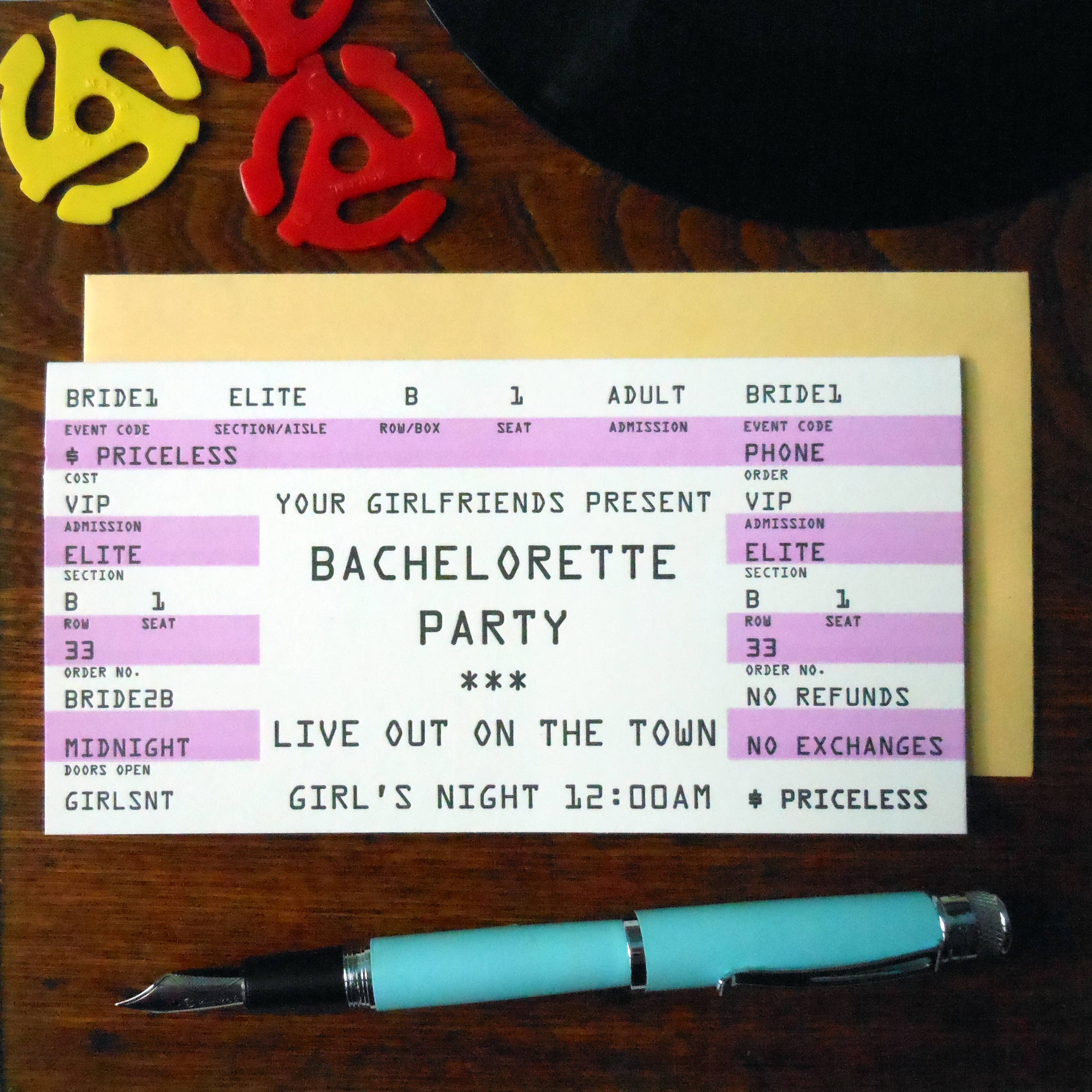 This wedding congrat card is inspired by raffle & carnival tickets. i've always loved the shape, colors of the paper & numbers on tickets. the typography is usually a little ho-hum & the printing sometimes off register but i can't help it, i like them. however, this card has dramatic typography & registered printing all on a fun yellow paper.