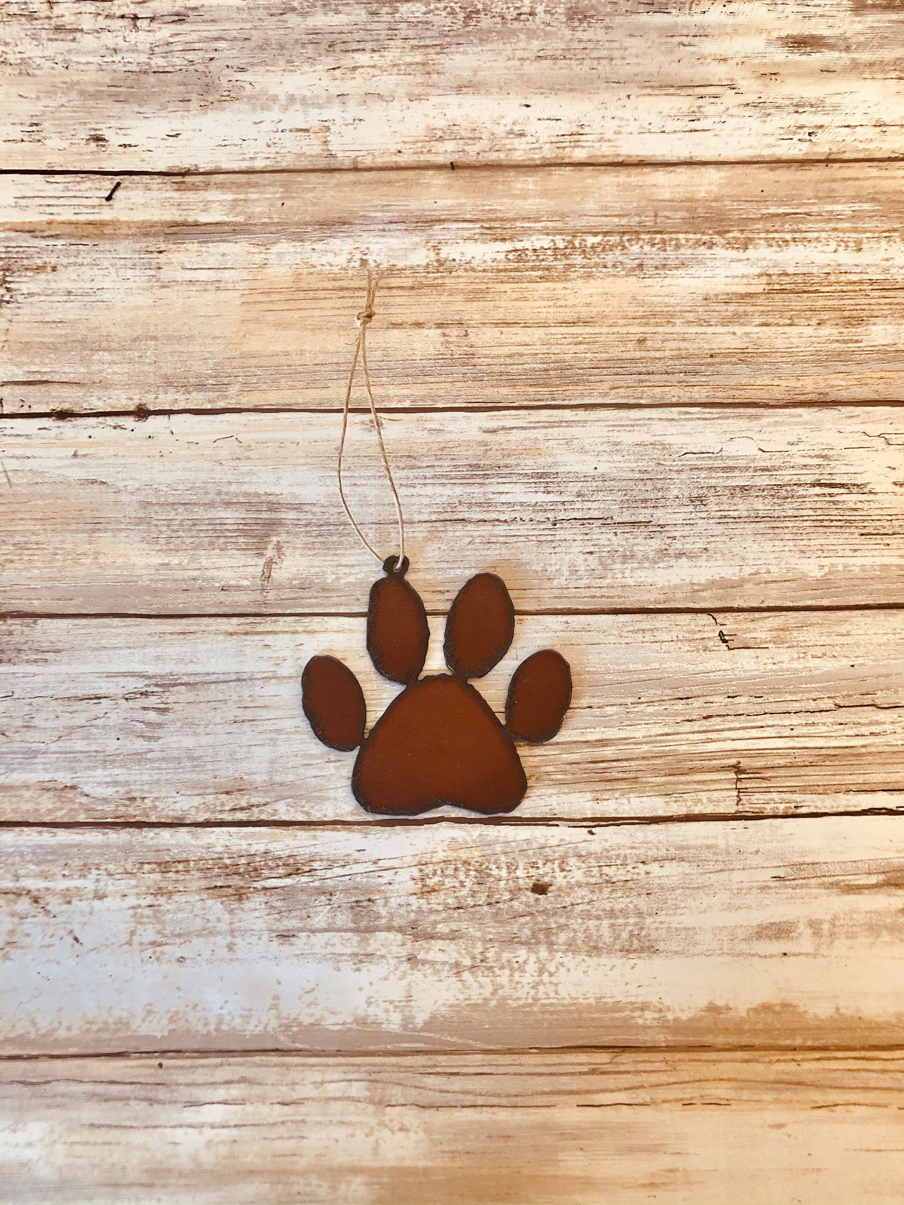 Paw Ornament 3.25 H x 3.50 W This Ornament is made with 18 Gauge Steel. Do to the Natural Rusting Process color may vary slightly, Made In Prescott Arizona