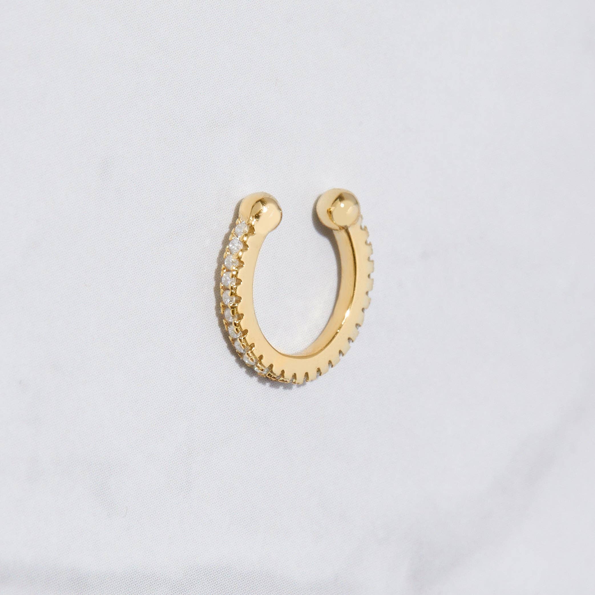 The Jennifer Crystal Ear Cuff is adorned with multiple cubic zirconia crystals with delicate gold framing. Perfect for stacking along your ear with other ear cuffs or worn as a single cuff. Make it your signature ear cuff for an elegant addition to everyday ensembles. · 18k gold plated 925 sterling silver · Cubic zirconia crystals · Cuff is bendable to adjust to the ear. · Sold as a single ear cuff