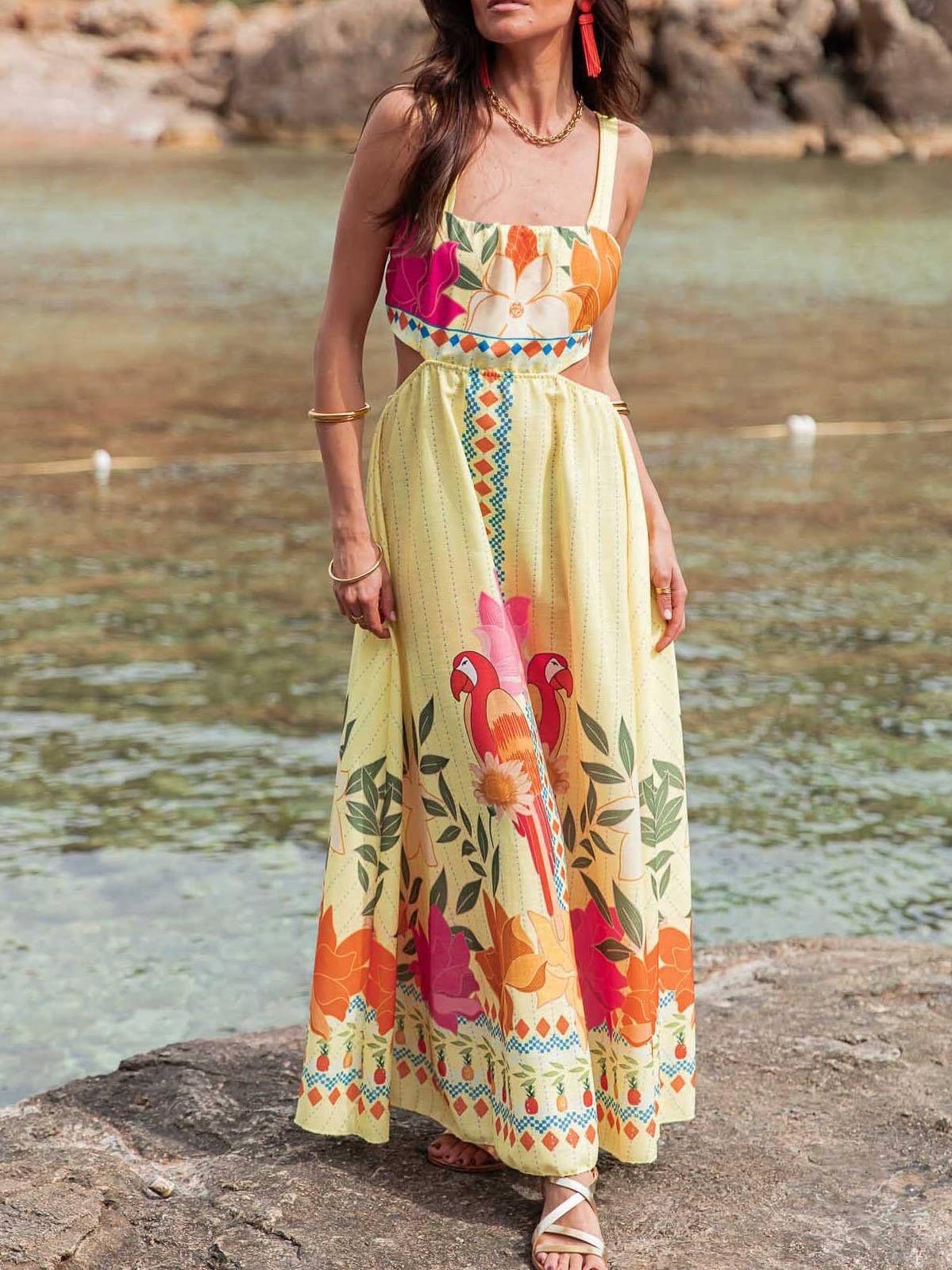 SKU: RCJY04184-orange-S Made in China Aesthetic: Bohemian and Casual Dress Style: Fit & Flare and Swing Fabric: 100%Polyester Neckline: Square neck Pattern: Tropical Season: Spring/Summer Skirt & Dress Length: Midi Sleeve Length: Sleeveless Weight: 300 g (10.58 oz)