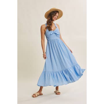Washed Tencel Tiered Dress Sweetheart neckline Criss cross straps Smocked back Midi length A-line skirt -Model wears: S / Model height: 5` 9"
