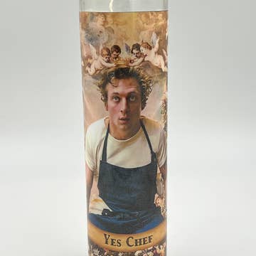 Yes Chef The Bear Prayer Candle Saint Celebrity Prayer Candle. White wax. 8 Inches Tall. Glass Container. High Quality Gloss Vinyl Label.