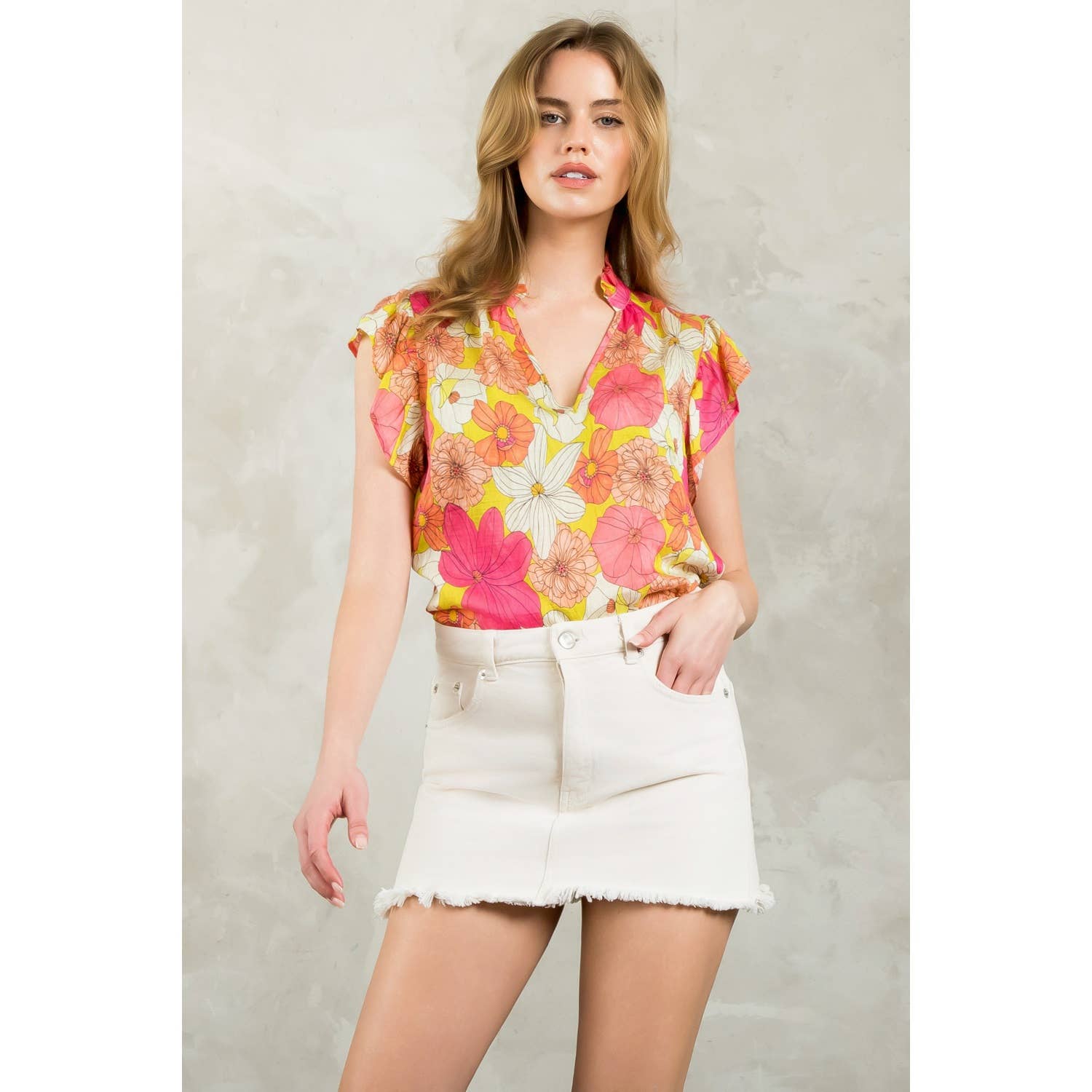 Ruched Sleeve Textured Top . / Style Measurements for Size S / Designed in USA - Body Length: 23 1/4 in - Bust Width: 35 1/2 in - Sleeve Length: 7 in . / Model Sizes - Wearing Size S - Height 5' 9", Bust 32", Waist 25 1/2", Hips 36" . / Prepack Contents - In a Piece of XL(1) per Color Only . / Fabric Content - WOVEN / 100% Polyester / Contrast: 80% Rayon, 20% Silk