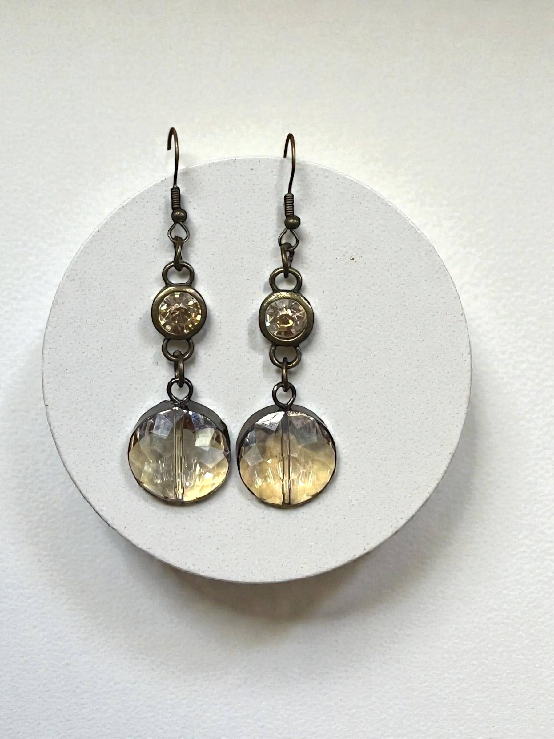 The image is set under a glass cabochon. The glass cabochon is set in an antique brass tray. The earrings measure 0.7 inches - the size of a dime. Each earring comes on a drop wire in antique brass alloy tray.
