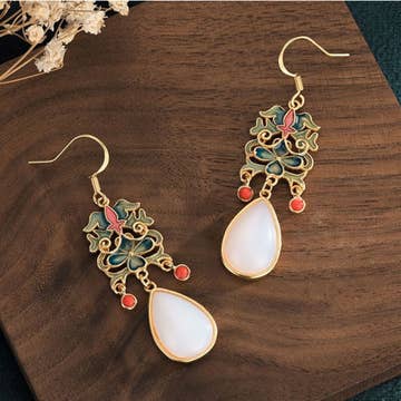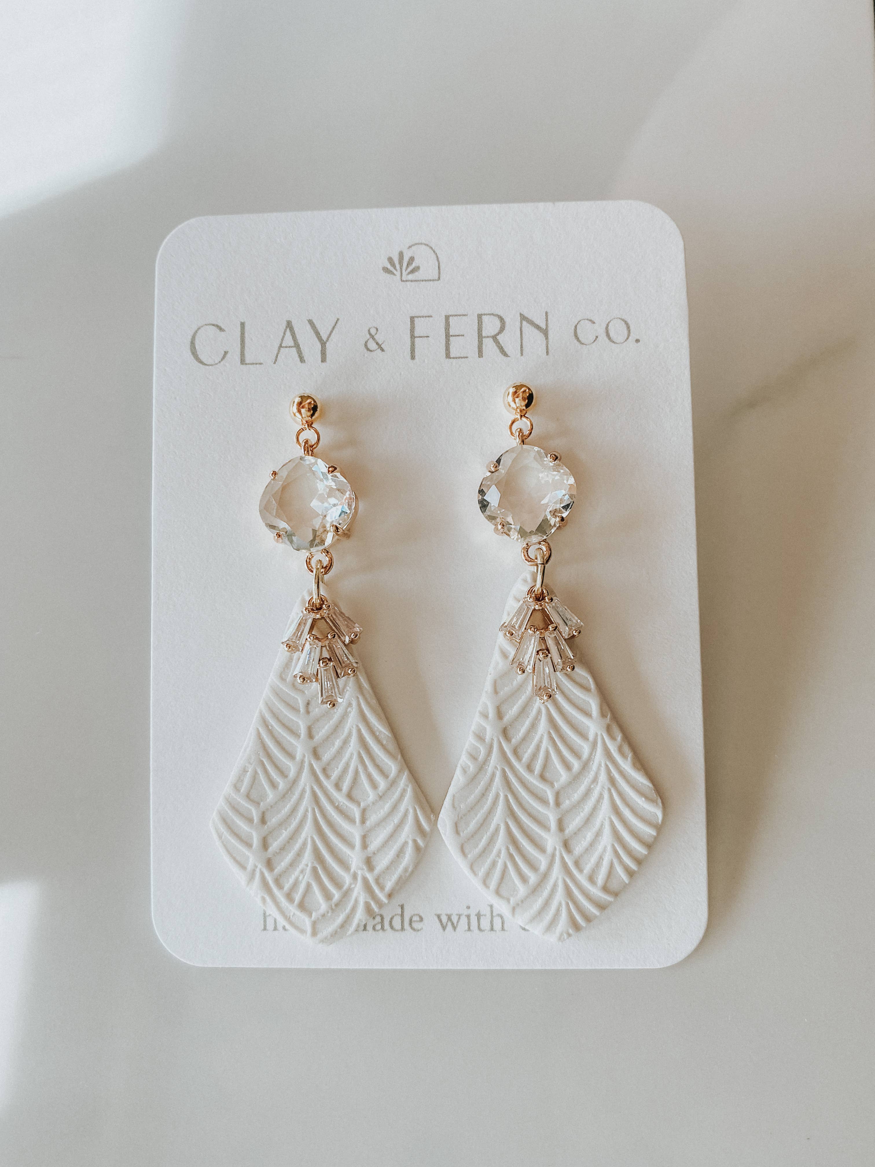 Handmade shimmery pearl white polymer clay earrings with gold plated cubic zirconia charm & floral texture Surgical steel stud closure Hypoallergenic metal - free of nickel or lead Clay earrings are lightweight & comfortable enough for all-day wear Due to handmade nature, slight imperfections and differences may occur in each pair of earrings