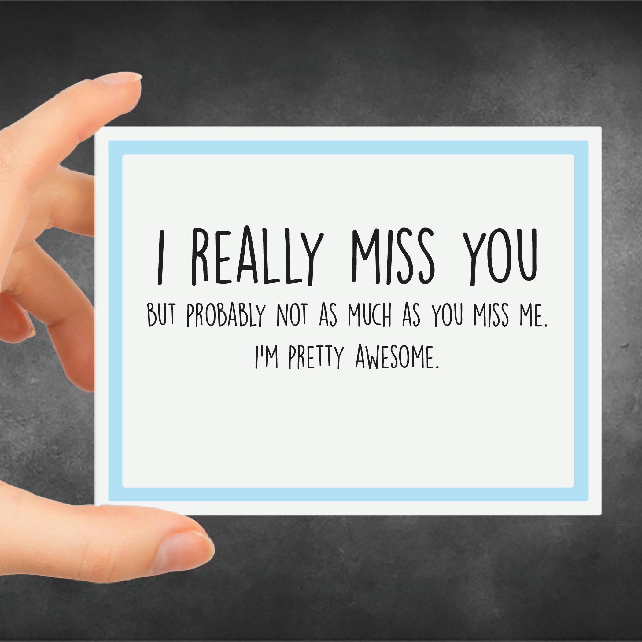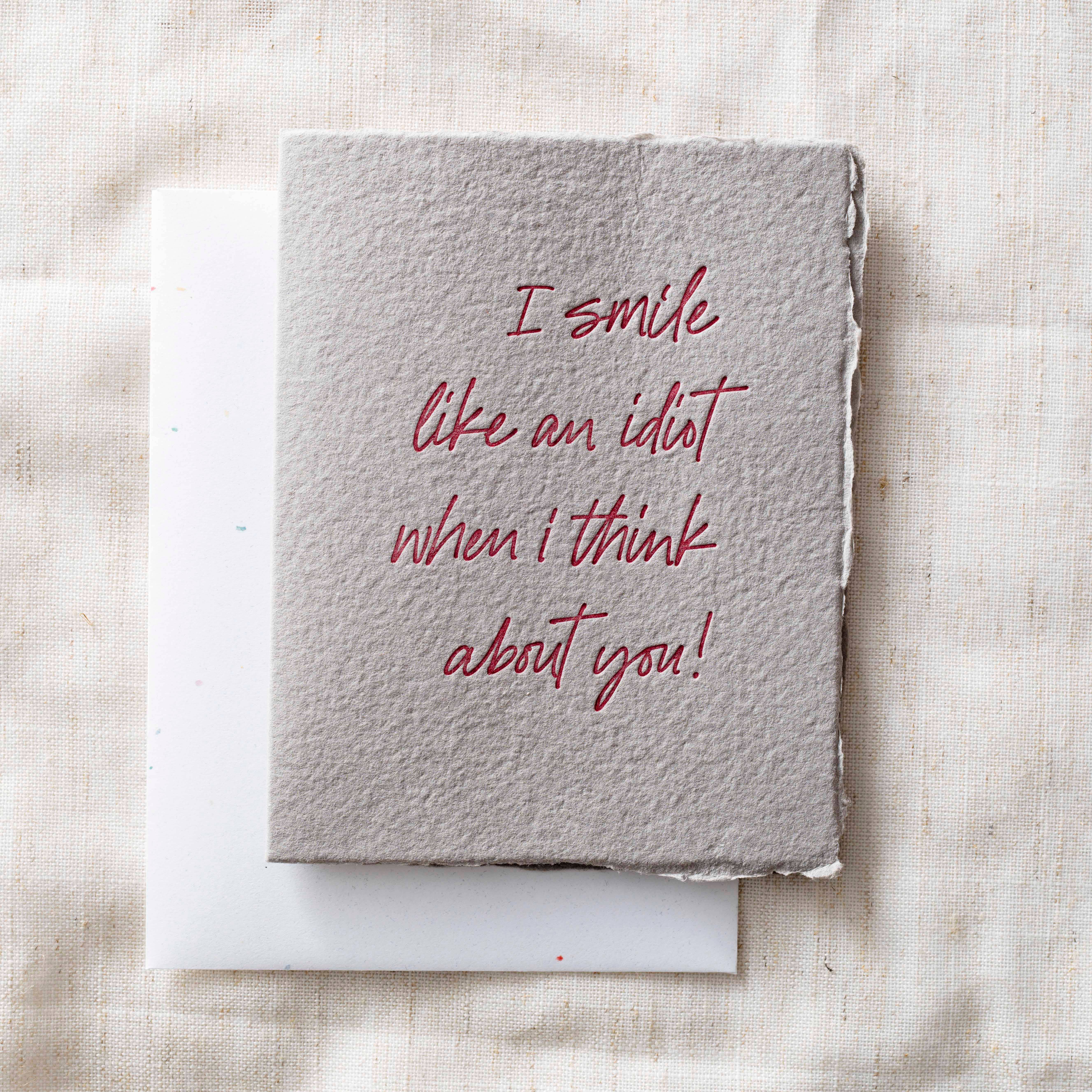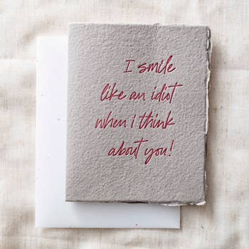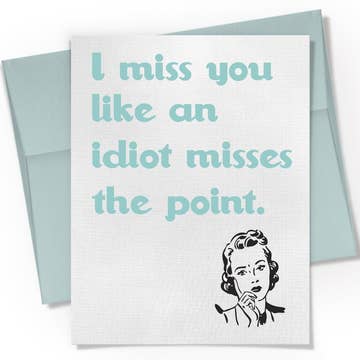 I miss you like an idiot misses the point. That's a lot. Card measures 4.25 inches by 5.5 inches. You will get 1 card with a coordinating colored envelope. It is printed onto a quality linen texture white card stock and is hand folded. All of my cards are printed in small batches in my studio and may have slight color variations from batch to batch. The card comes blank on the inside so you can write your own message. Comes in a little cello sleeve to protect it until you are ready to use or give as a gift.