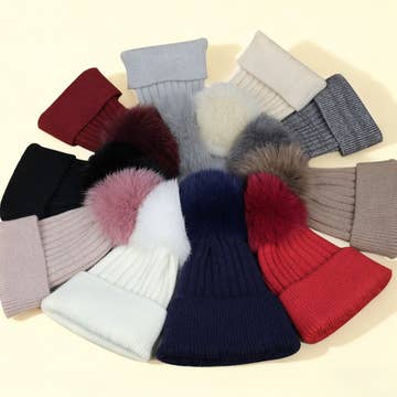 C.C Solid Ribbed Infant Natural Fur Double Pom Pom Beanie 14"-16" (35.56cm-40.64cm) 100% Acrylic Made in China