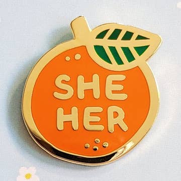 Hard enamel orange pin with she/her pronouns and a little leaf, to share your pronouns in a cute and subtle way. For all fruit lovers, queer friends, and allies! Details * hard enamel * yellow gold plating * backing card * backed with 1 black rubber clutch * 1 inch (25mm) length at the widest part (orange to leaf) * the body of the orange is 7/8 inches (22mm) in diameter These are small pins designed with lapels in mind, but they're also perfect as gifts, for display, on beanies, backpacks, tote bags etc! Please feel free to reach out to me if you have any questions or issues with your order :)