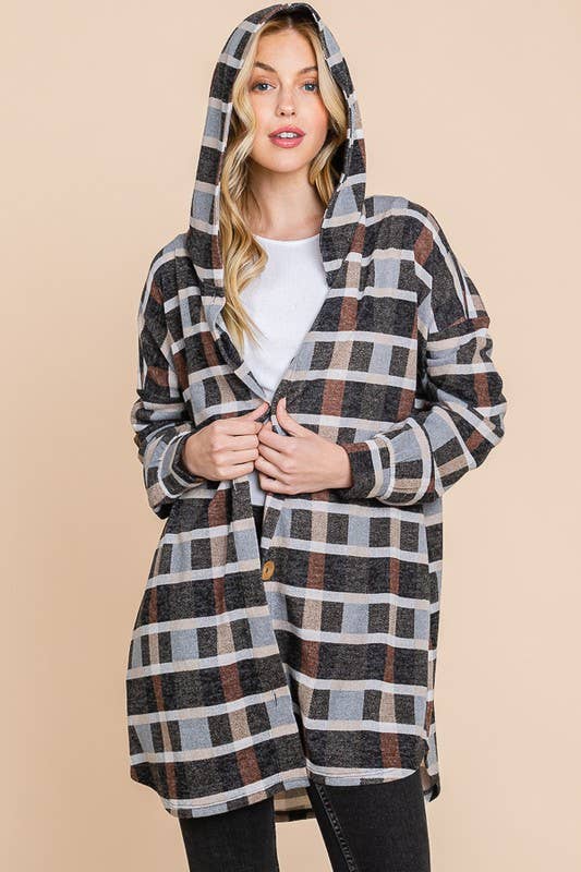 Over size plaid flannel shacket with hoodie and pockets
