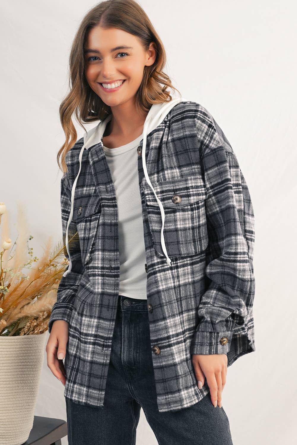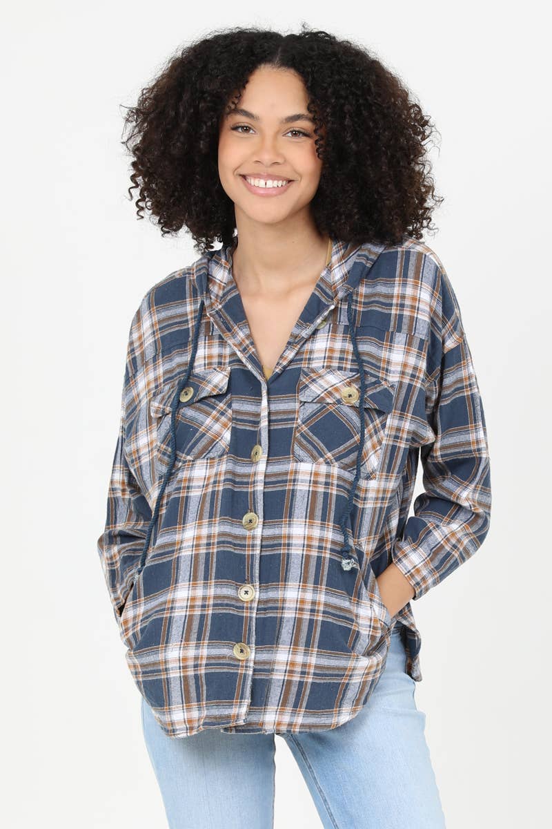 Wholesale Over size plaid flannel shacket with hoodie and pockets