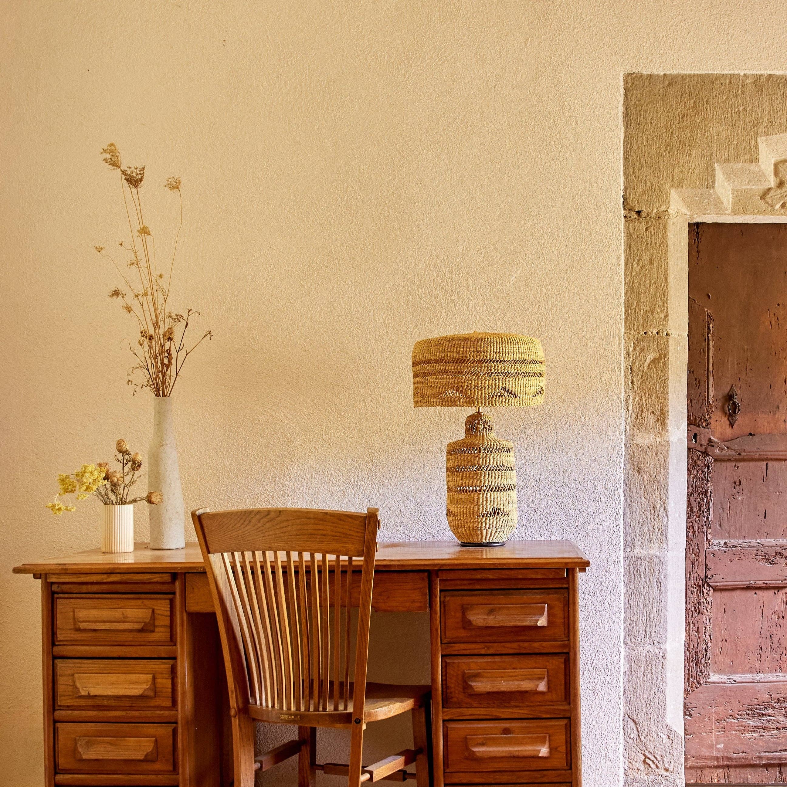 Large sculptural wall lamp featuring a handwoven shade with a wood and brass wall bracket. The Admirador L Wall Lamp combines bold geometric design with natural texture, offering warm ambient light ideal for dining rooms, lounges, bedrooms or boutique interiors. Handmade in Ghana and finished in Barcelona by Golden Editions. Information: * When in stock, delivery within 3 weeks. If on pre-order, delivery in 6-8 weeks. * Structure woven by hand in Veta Vera in Bolgatanga, Ghana, * approximately H.33cm x W.39cm * Colour options: Natural/Midnight (black), Natural/Ginger (terracotta) and Natural/Noisette (earthy brown) * CE certified electrics bought in Europe * Assembled to order in our workshop in Barcelona. Get in touch if you have a special request. * Slight differences in shape and colour are completely normal. * Not recommend for use outside or on terraces or hanging in a hot humid room in front of a window. * Colours are natural and may fade if hung in direct sunlight. * Please note : we recommend, using a LED bulb max. 10w Sold with: * Wood and Metal wall support * 1.5 meters of cloth covered twisted cable with switch and CE plug, colour black please let us know if you prefer white or gold (which is a similar colour to the straw) UL available for US * Cable can also be cut and the lamp can be directly fixed to the electrical output in a wall * E14 Black lamp holder or E26 for USA * Brass screws.