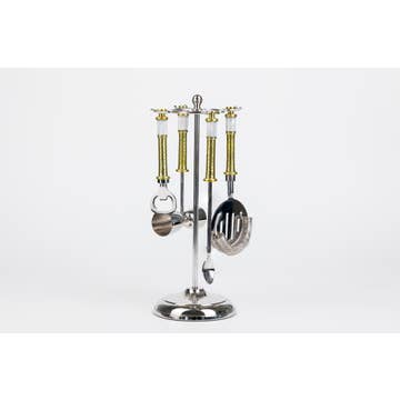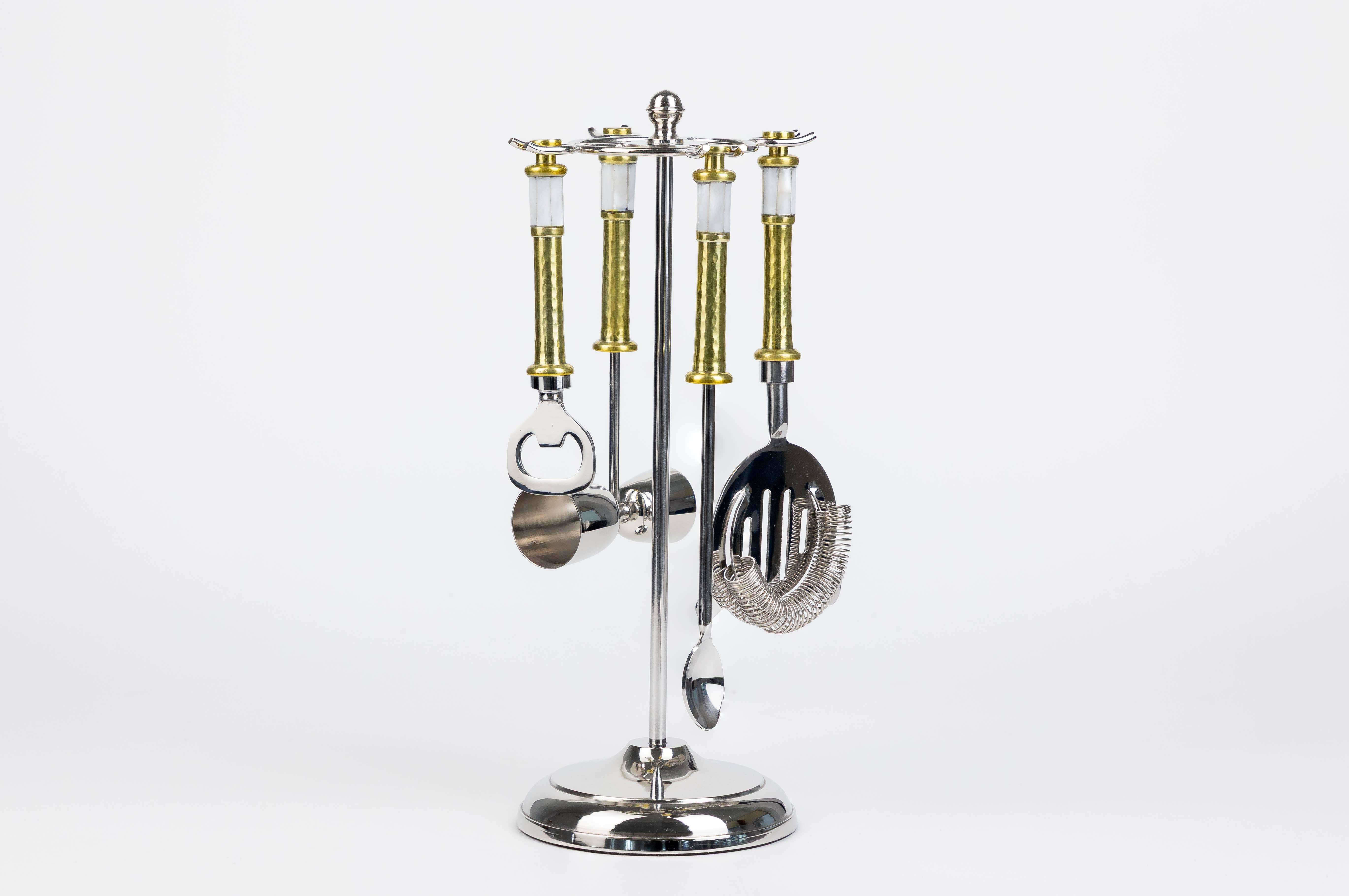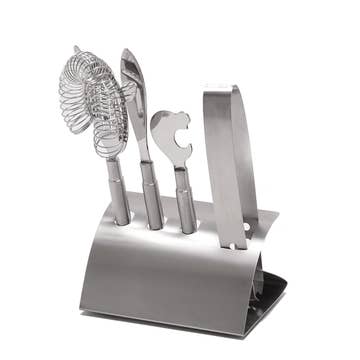 This dachshund-inspired bar tool set contains all the essentials required for crafting your signature libation. Designed to bring a hint of whimsy and luxury to any home bar, this 5-piece set makes a stunning statement piece for your next gathering. Semi-Handmade India Material: Stainless Steel & Nickelplate Color: Stainless Overall Dimensions Stand 12.0"L x 3.40"W x 5.25"H Bottle Opener 5.60"L x 1.60"W x .75"H Strainer 7.50"L x 3.5"W x .75"H Knife 7.50"L x 1.25"W x .75"H Double Jigger 6.0"L x 1.60"W x .75"H 3oz General Care Hand-Wash Recommended